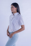 La base de la blusa suele ser un tejido ligero y transpirable como el lino y una mezcla de popelina, lo que realza la delicadeza de las perforaciones y la hace cómoda para diversas estaciones. Los botones, a menudo pequeños y discretos, complementan el diseño sin restarle protagonismo a los detalles perforados. Es una prenda versátil que puede elevar un look casual con jeans o complementar una falda formal para una ocasión más elegante.