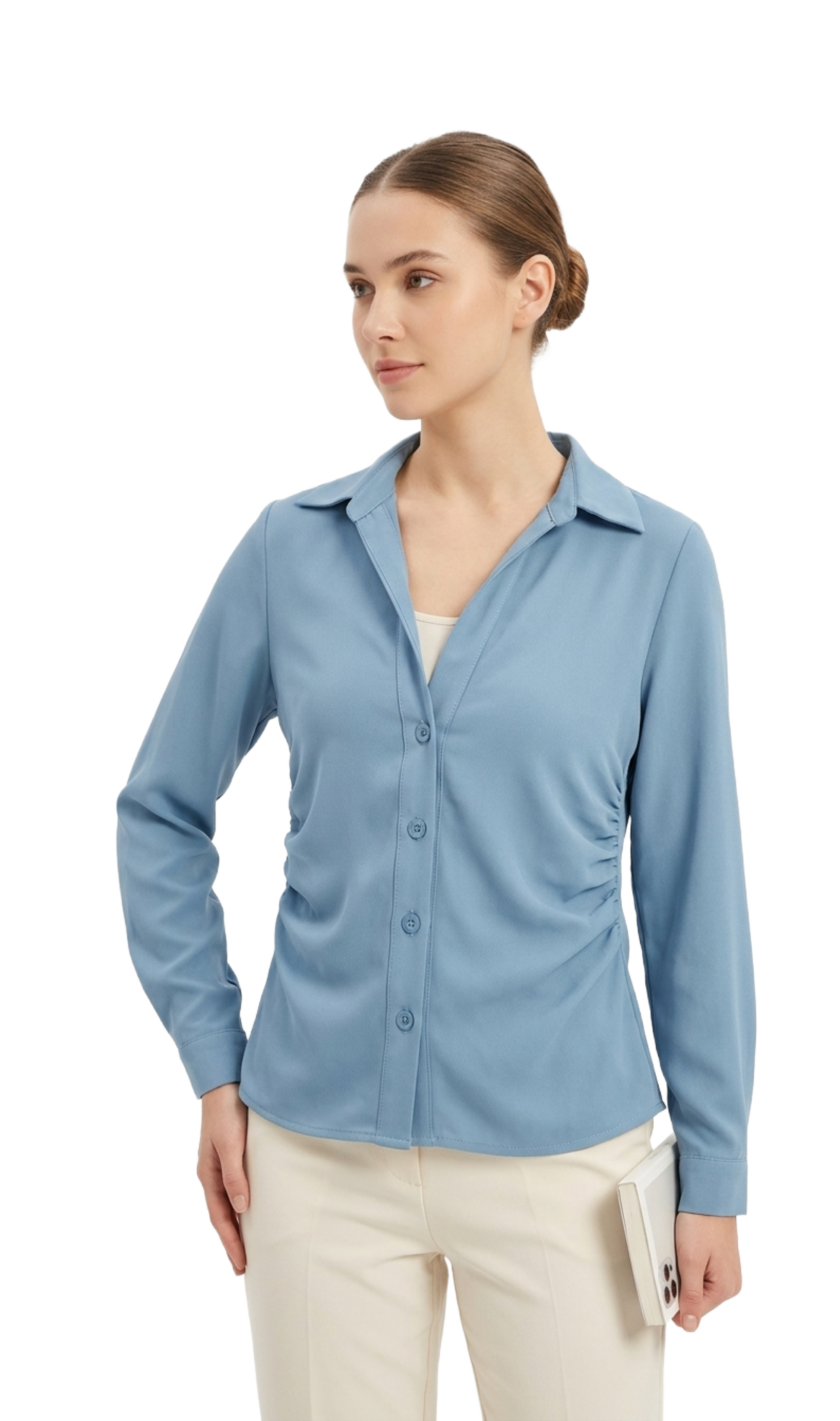 Blusa elegante en tono azul intenso con cierre de botones frontales y detalle de plisado en la cintura que define la silueta. Perfecta para crear looks sofisticados tanto en la oficina como en ocasiones casuales. Su corte versátil se adapta a diferentes tipos de cuerpo, mientras que el plisado estratégico añade movimiento y comodidad. Ideal para combinar con pantalones, faldas o jeans. #BlusaAzul #BlusaAbotonada #PlisadoEnCintura #ModaFemenina #BlusaElegante #EstiloOficina #BlusaVersátil #BocarosaStyle #ModaMexicana #BlusaPerfecta