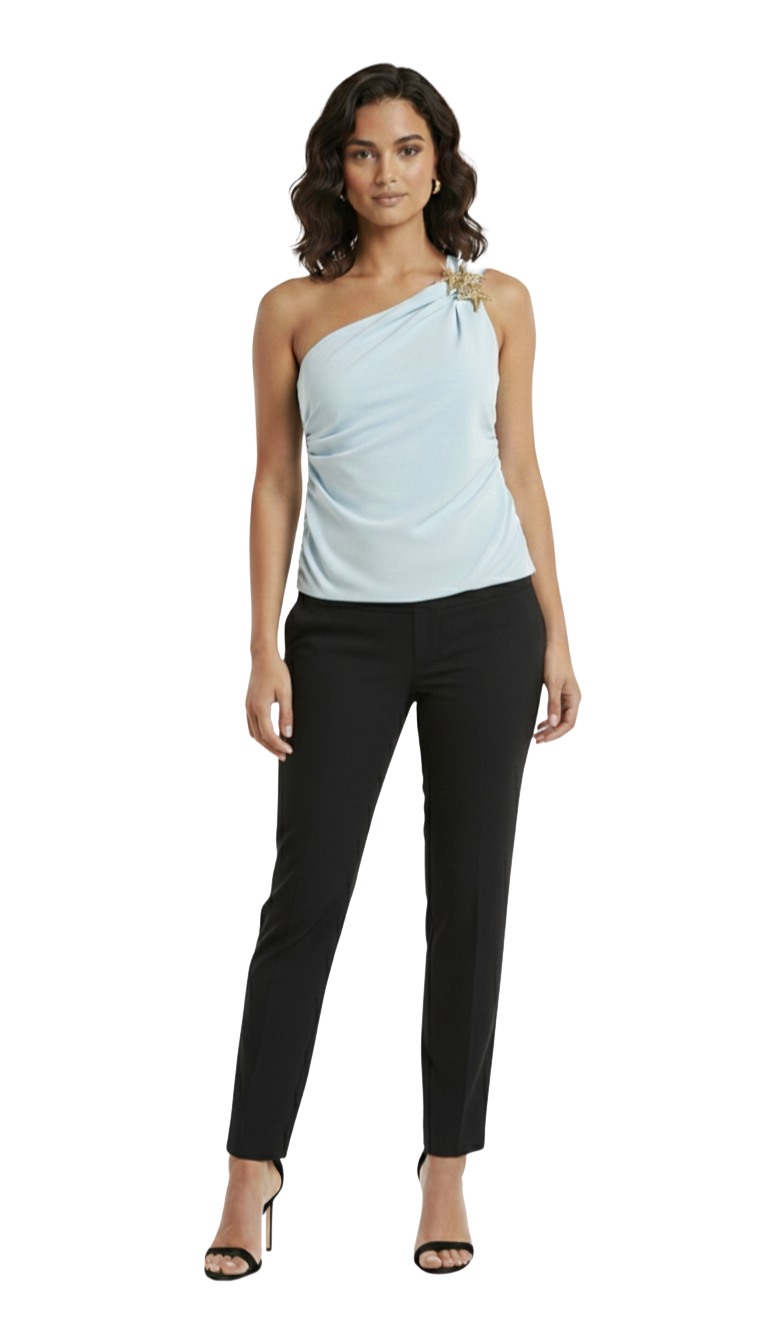 Blusa elegante confeccionada en tela de alta calidad con un diseño asimétrico de un tirante que favorece la silueta. Destaca por sus delicadas estrellas metálicas estratégicamente distribuidas, añadiendo un toque sofisticado y luminoso al conjunto. Perfecta para ocasiones especiales o para elevar tu look cotidiano con un detalle distintivo. Cómoda y versátil, combina con diversos estilos de pantalones o faldas.
