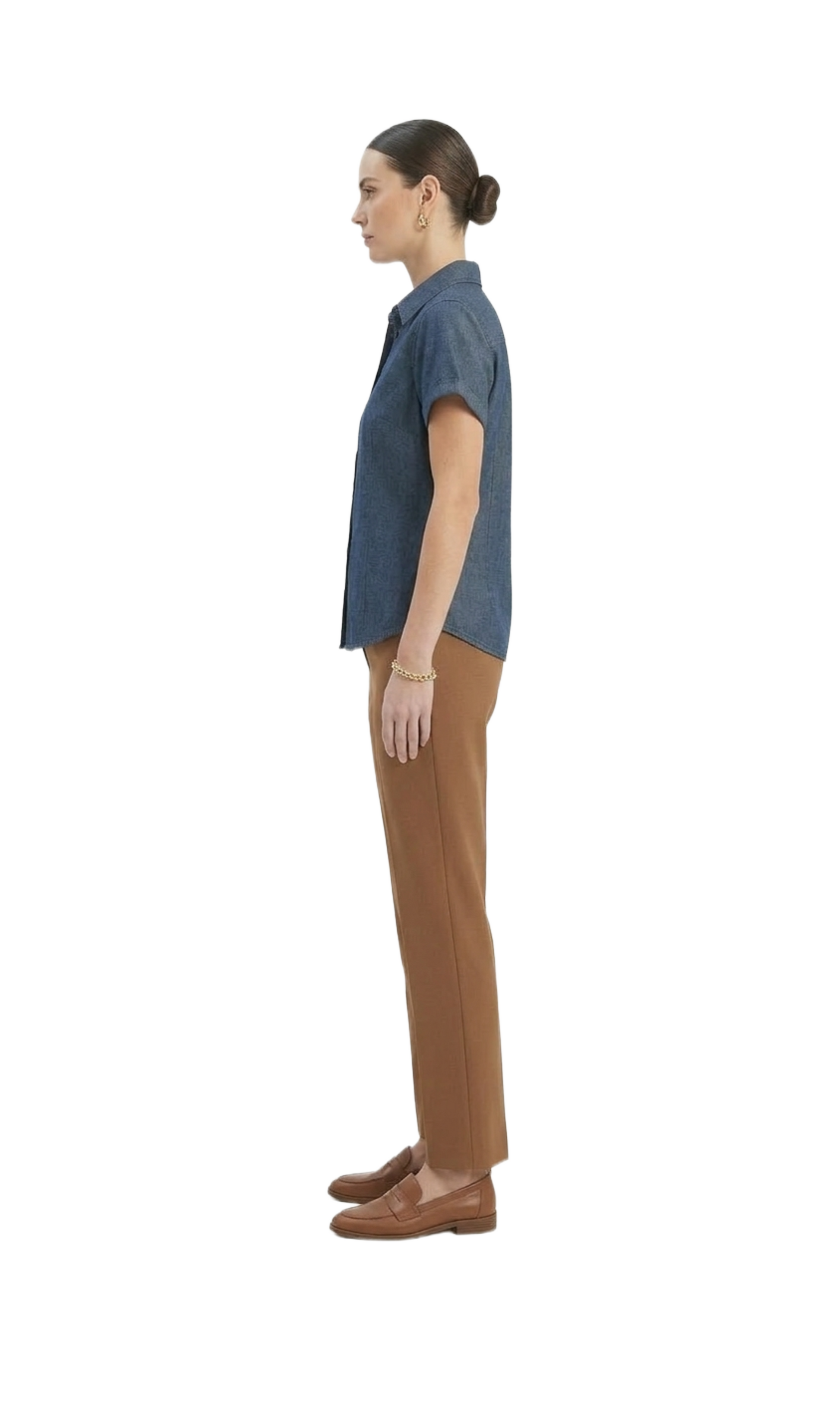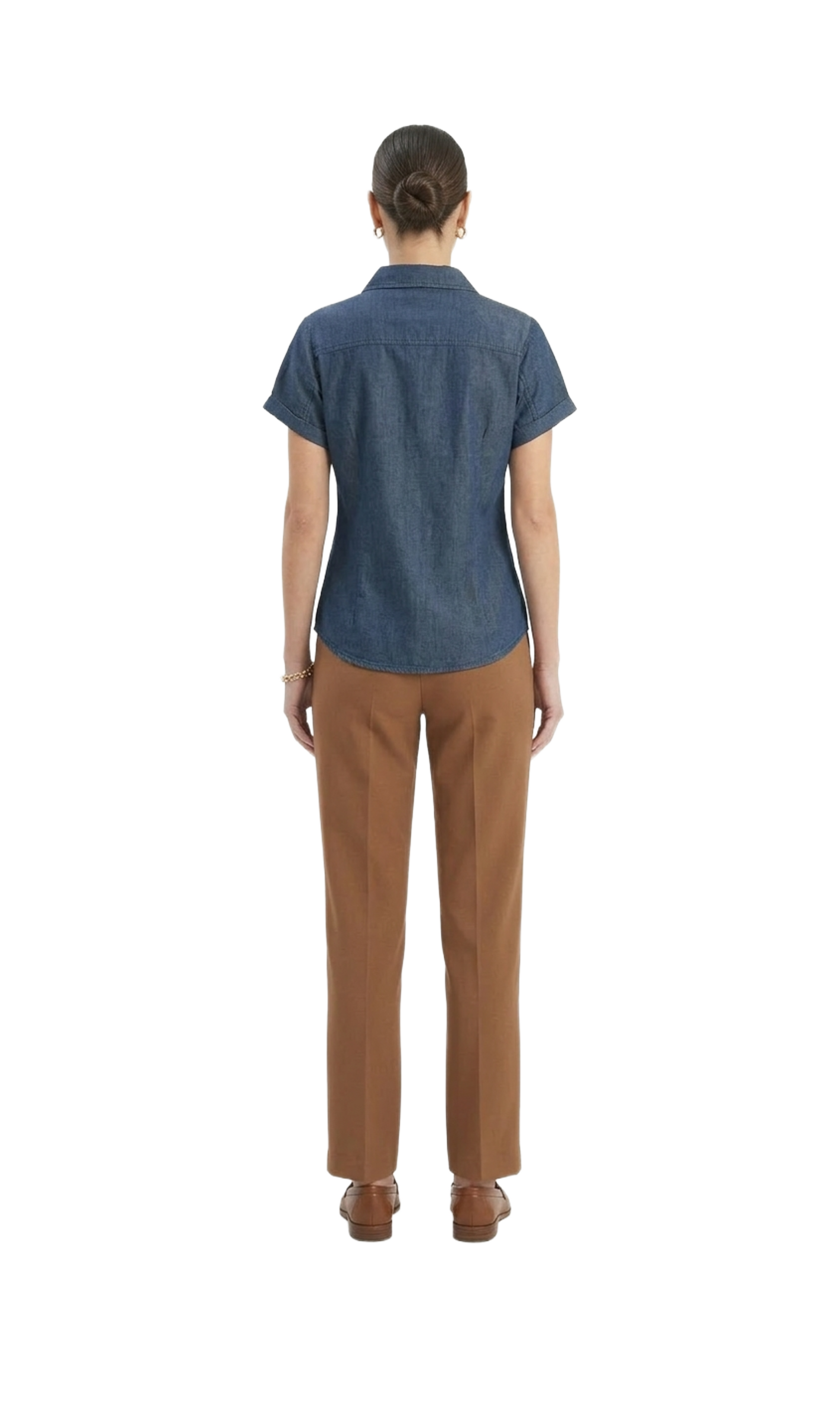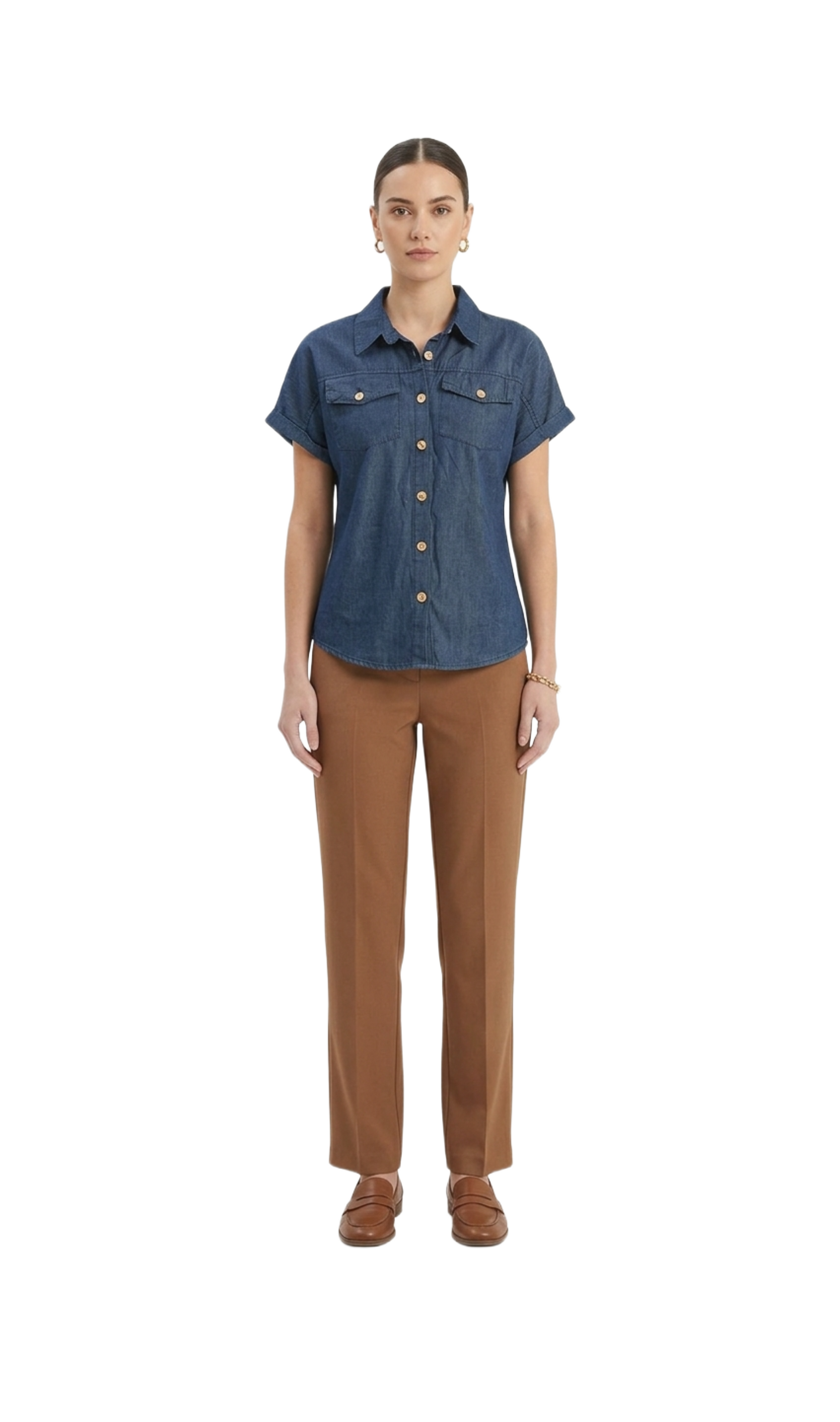 Blusa imitación mezclilla con botones cafes y bolsas en pecho