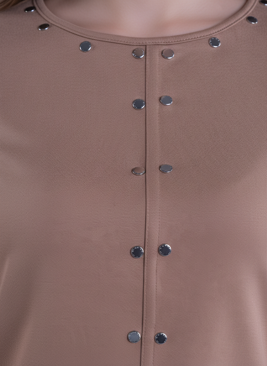 Esta blusa de manga corta es la pieza perfecta para un estilo audaz y lleno de personalidad. Confeccionada en suave gamuza, ofrece un tacto lujoso y una caída impecable, mientras que los estoperoles metálicos estratégicamente colocados en el cuello o los hombros le dan un toque moderno y rockero. Es la combinación ideal entre lo chic y lo rebelde. Puedes usarla para darle un toque diferente a un atuendo casual o para un look de noche inolvidable.