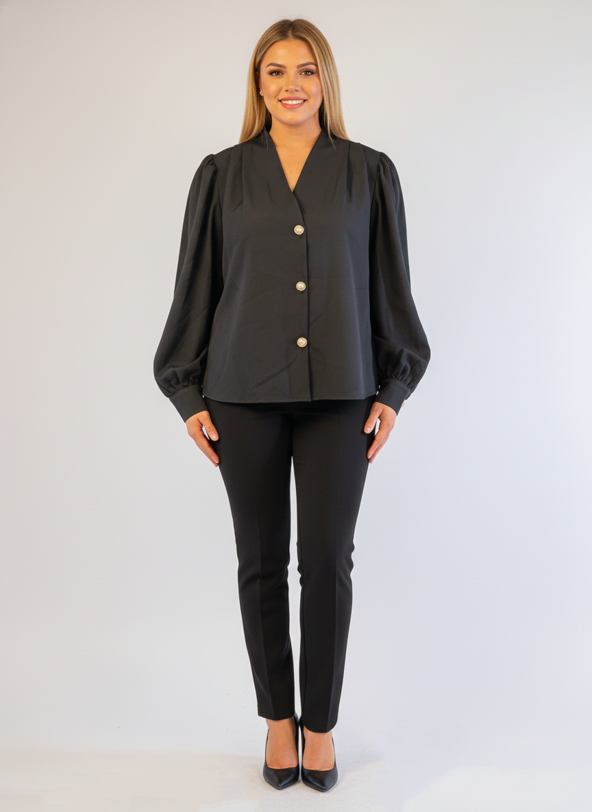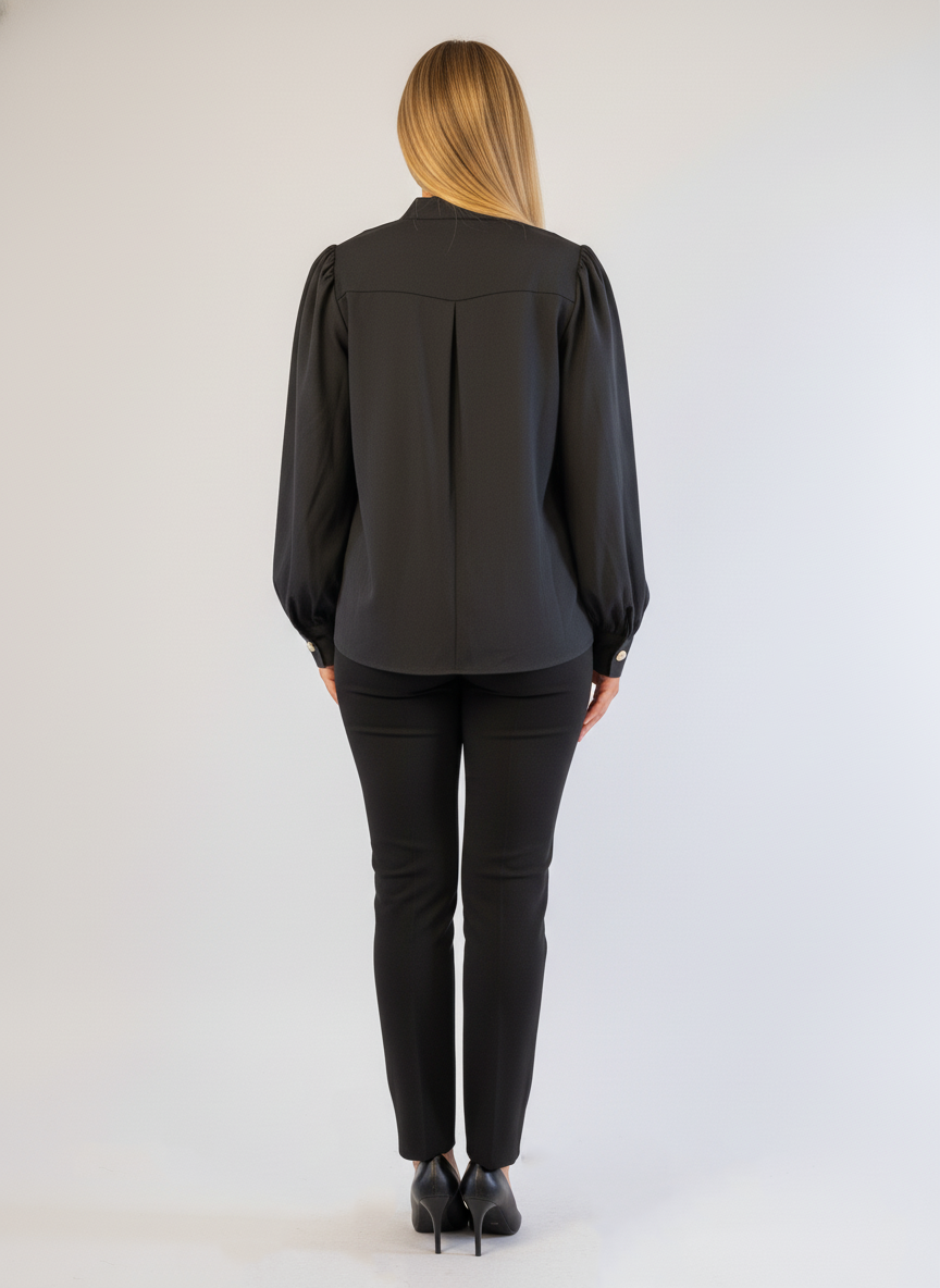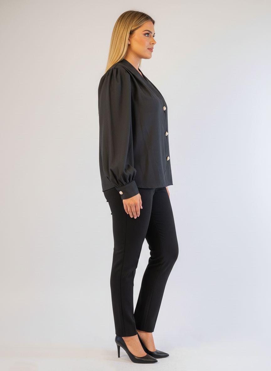 Blusa negra abotonada con mangas de globo que combina elegancia clásica con un toque contemporáneo. El corte estructurado y los botones frontales ofrecen versatilidad para looks profesionales o casuales. Las mangas voluminosas añaden movimiento y sofisticación, mientras que el color negro garantiza fácil coordinación con cualquier prenda. Perfecta para quienes buscan prendas versátiles que transicionen sin esfuerzo entre diferentes ocasiones. #BlusaNegra #MangaDeGlobo #ModaFemenina #BlusaAbotonada #EstiloClásico #VersátilYElegante #ModaConEstilo #PrendaEsencial