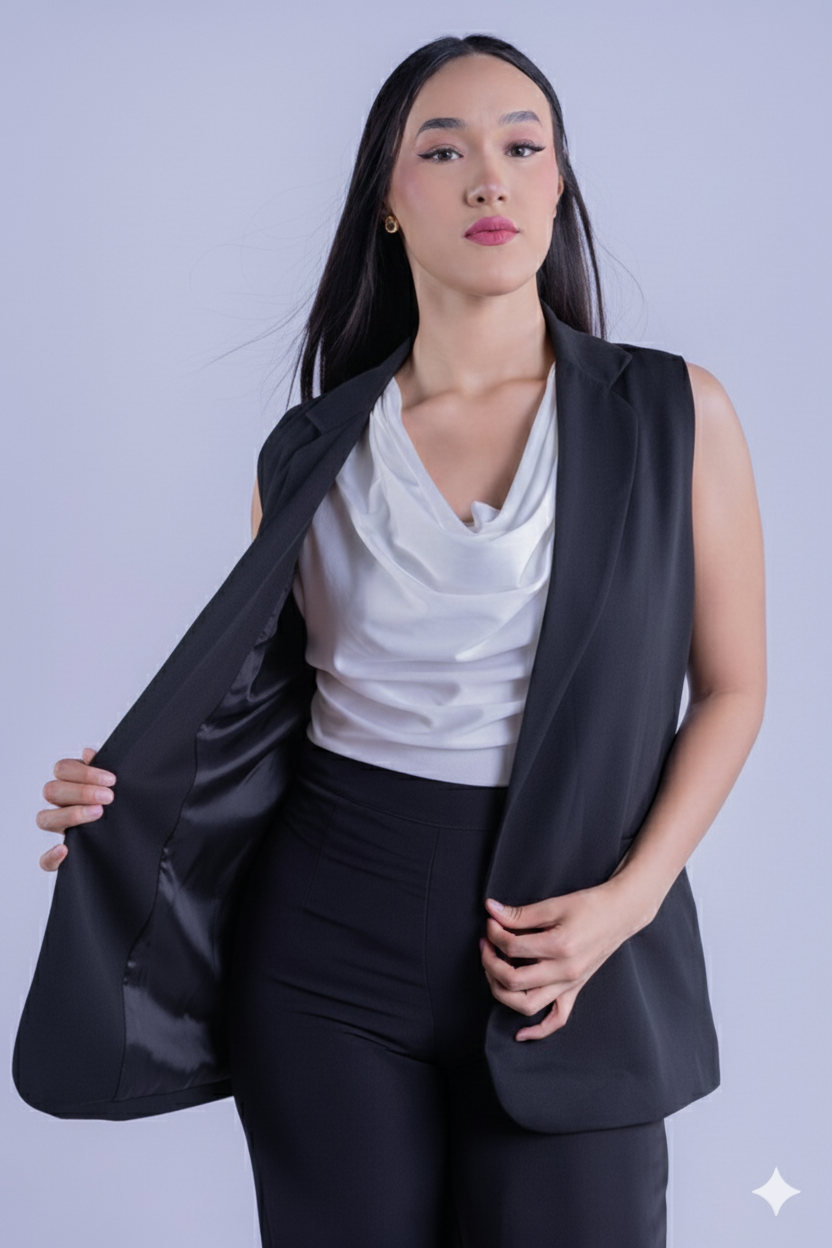 Eleva tu estilo con este elegante chaleco abierto con solapa. Una prenda versátil y sofisticada que añade un toque de formalidad a cualquier atuendo sin sacrificar la comodidad. Su diseño sin mangas y el corte abierto lo hacen ideal para combinarlo con blusas, camisetas o suéteres de cuello de tortuga. Ya sea para la oficina, una reunión casual o un evento especial, este chaleco es el toque final perfecto para crear un look pulido y moderno.