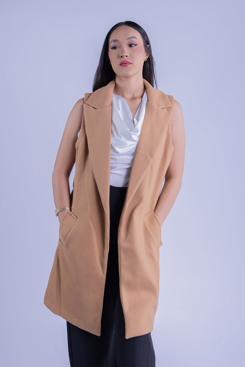 Este chaleco con solapas es la prenda perfecta para añadir una capa de sofisticación a cualquier atuendo. Inspirado en la sastrería clásica, su diseño con solapas estructuradas aporta un aire de elegancia y formalidad, ideal para elevar un look simple a algo extraordinario.