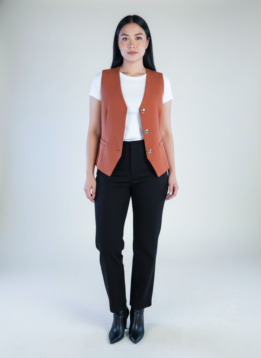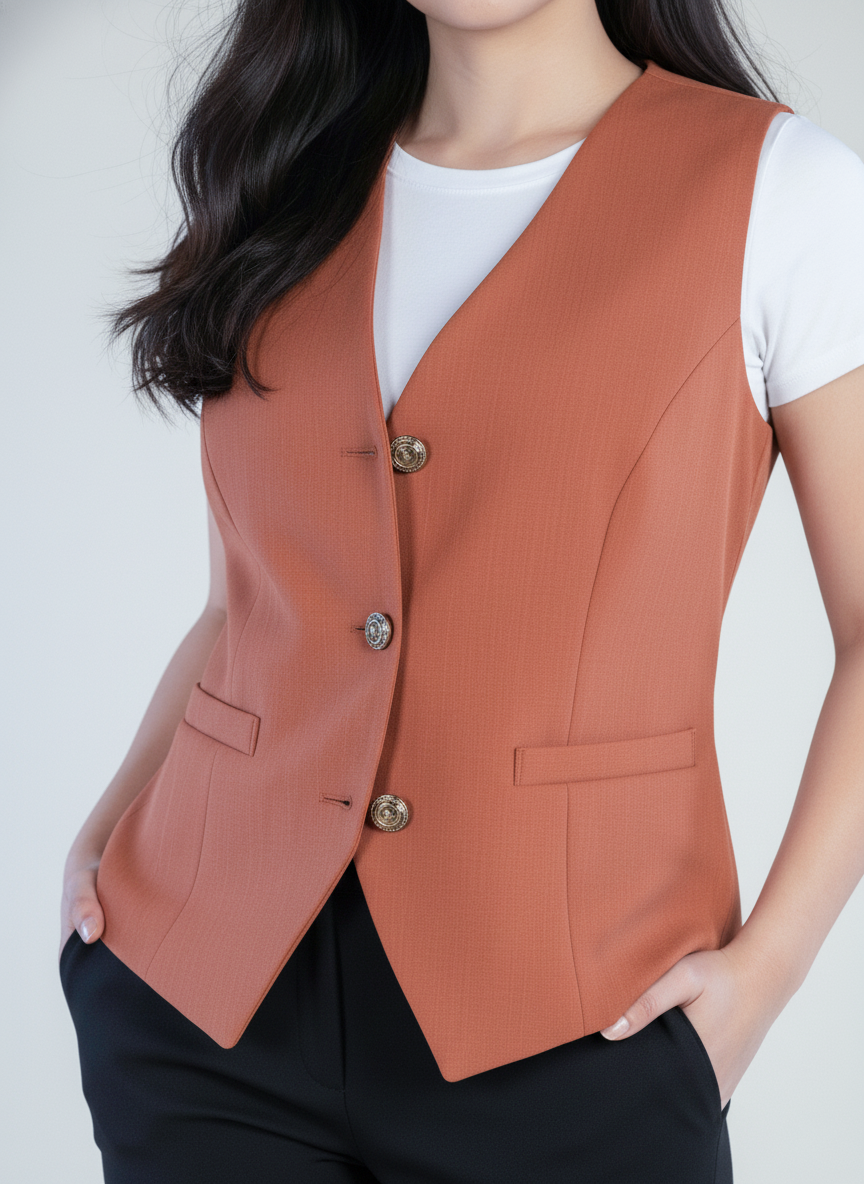 Chaleco naranja de vestir abotonado que combina elegancia y versatilidad. Confeccionado con tela de calidad premium, presenta un corte estructurado que favorece la silueta y se adapta a diferentes ocasiones, desde eventos formales hasta looks casuales sofisticados. El cierre de botones permite ajustes personalizados para mayor comodidad. Su color naranja vibrante añade un toque de personalidad y modernidad a cualquier conjunto. Pieza imprescindible para quienes buscan elevar su guardarropa con prendas versátiles y de impacto visual. #ChalecosDeVestir #NaranjaVibrant #ModaFemenina #VestuarioFormal #EleganciaModerna #ChalecosAbotonados #EstiloSofisticado #PrendaVersátil #ModaConEstilo #AccesoriosFashion