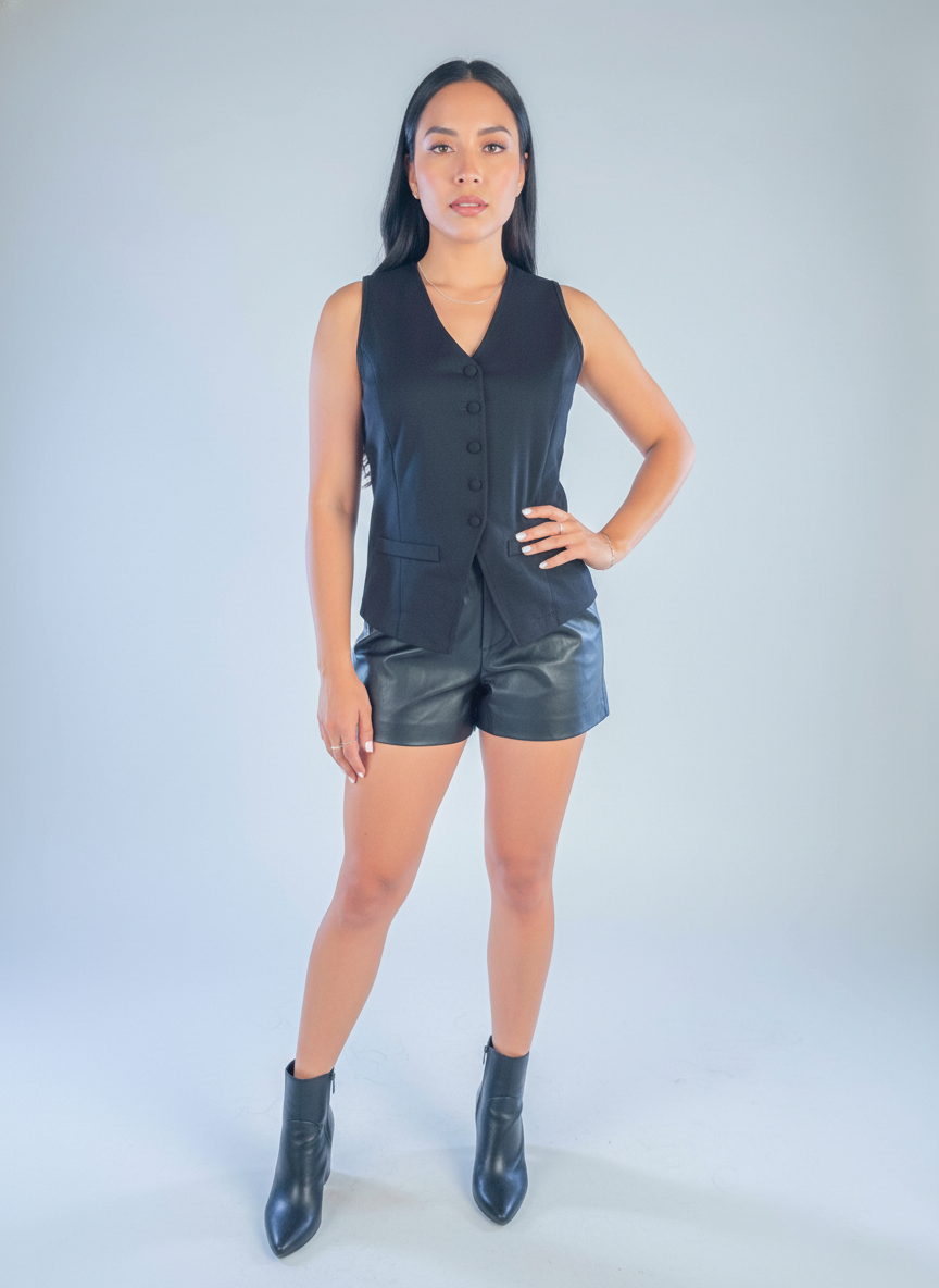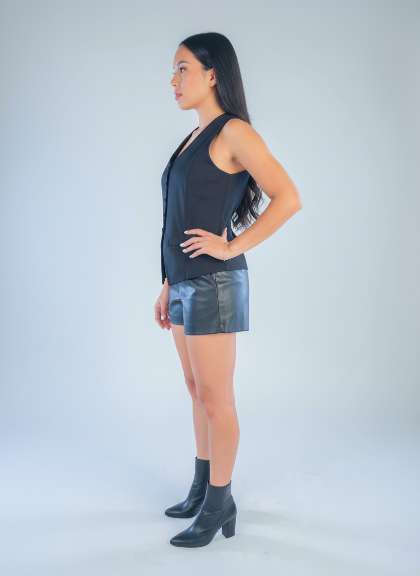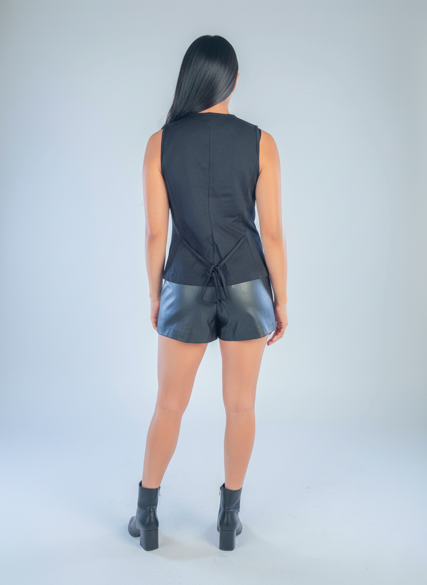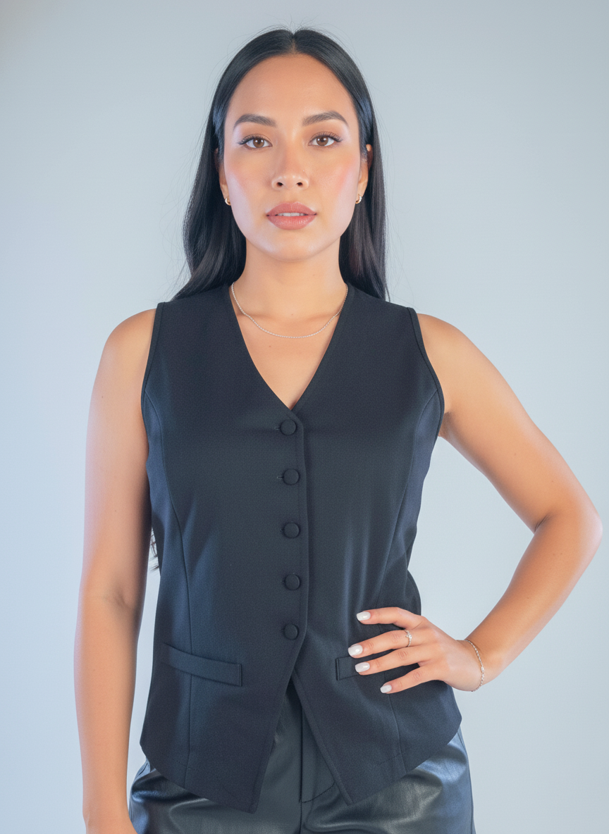 Chaleco negro abotonado con diseño versátil que combina estructura y comodidad. Confeccionado con botones frontales que permiten ajuste personalizado y amarre en la espalda para un fit impecable. Ideal para crear looks sofisticados, desde casual hasta formal. Pieza esencial que eleva cualquier outfit con elegancia minimalista. #ChalecosNegros #ModaFemenina #VestidoVersátil #EstiloMinimalista #ChalecosAbotonados #ModaConEstilo #LooksFormales #PiezasEsenciales #FashionNegro #AmarrEnEspalda