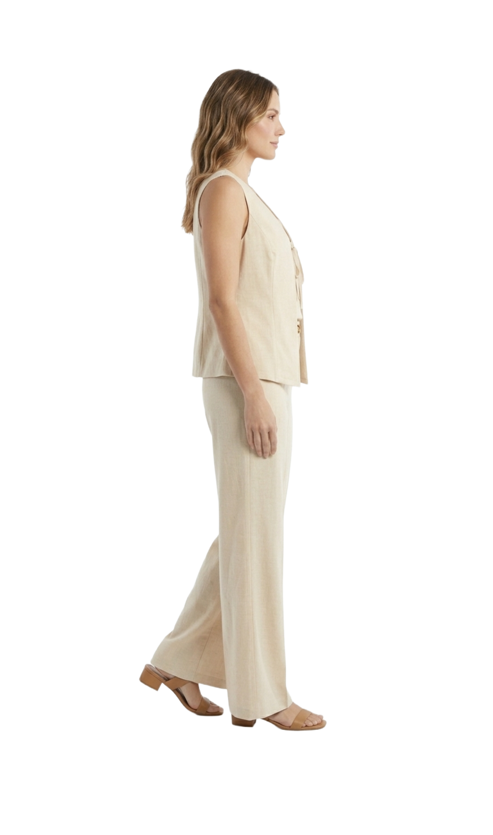 Conjunto beige de blusa con detalle de amarre al frente y pantalón