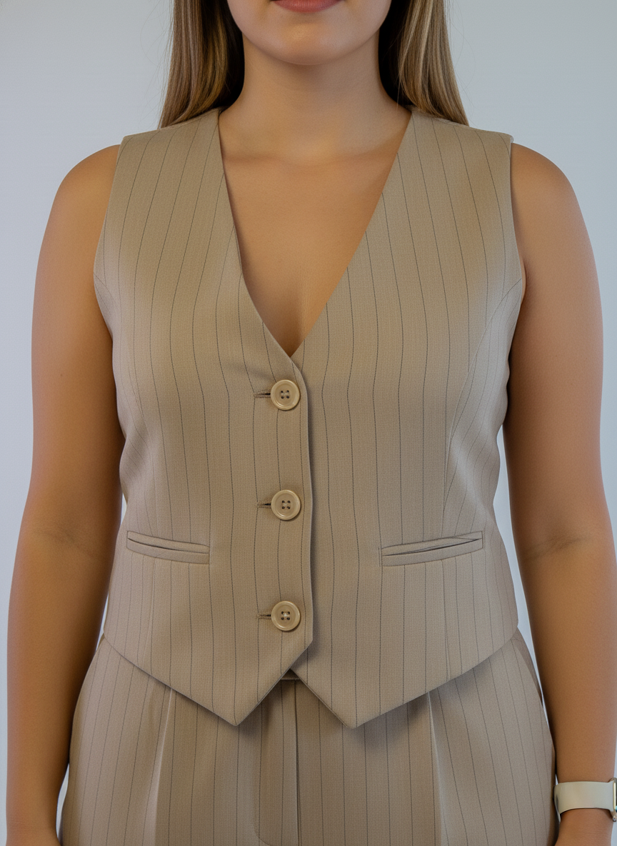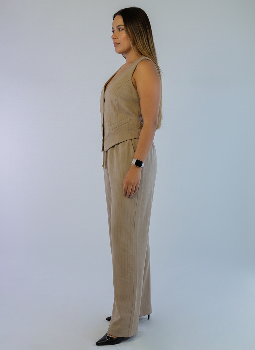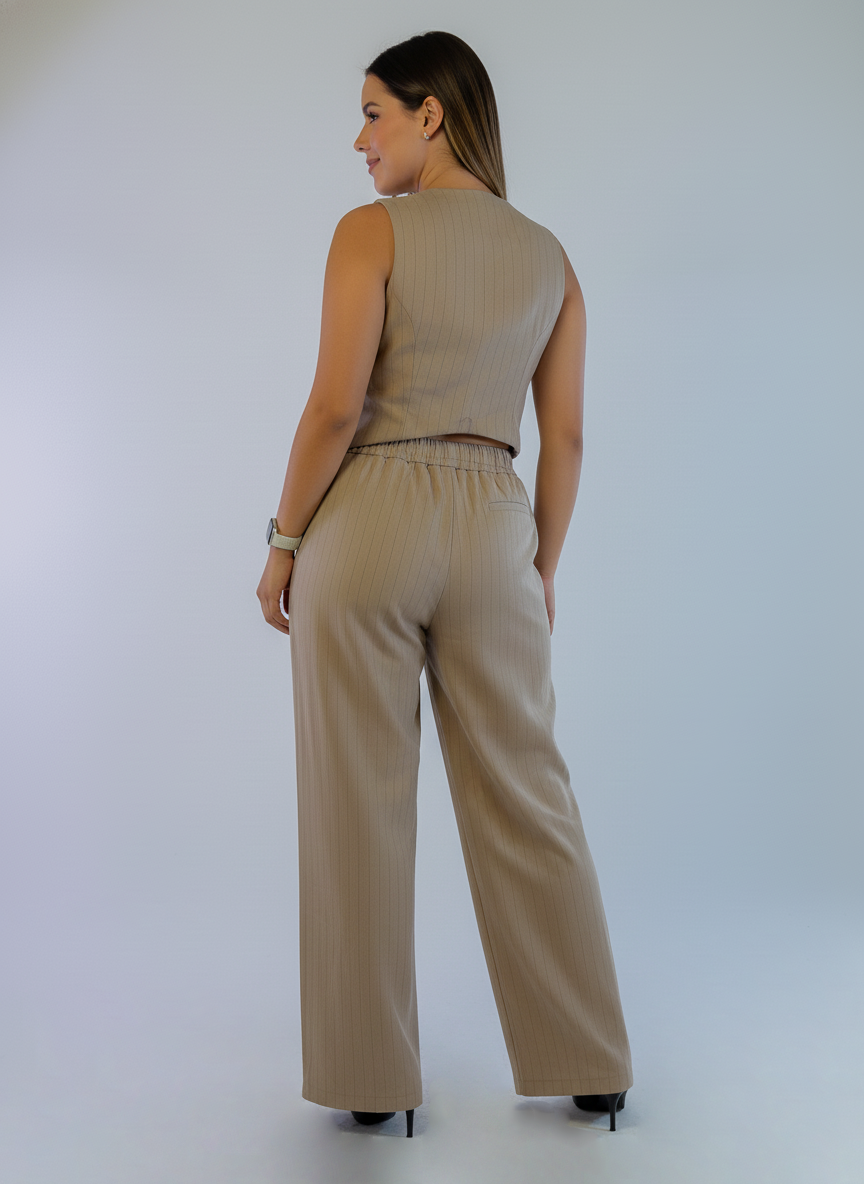 Conjunto beige de líneas verticales de pantalon y chaleco