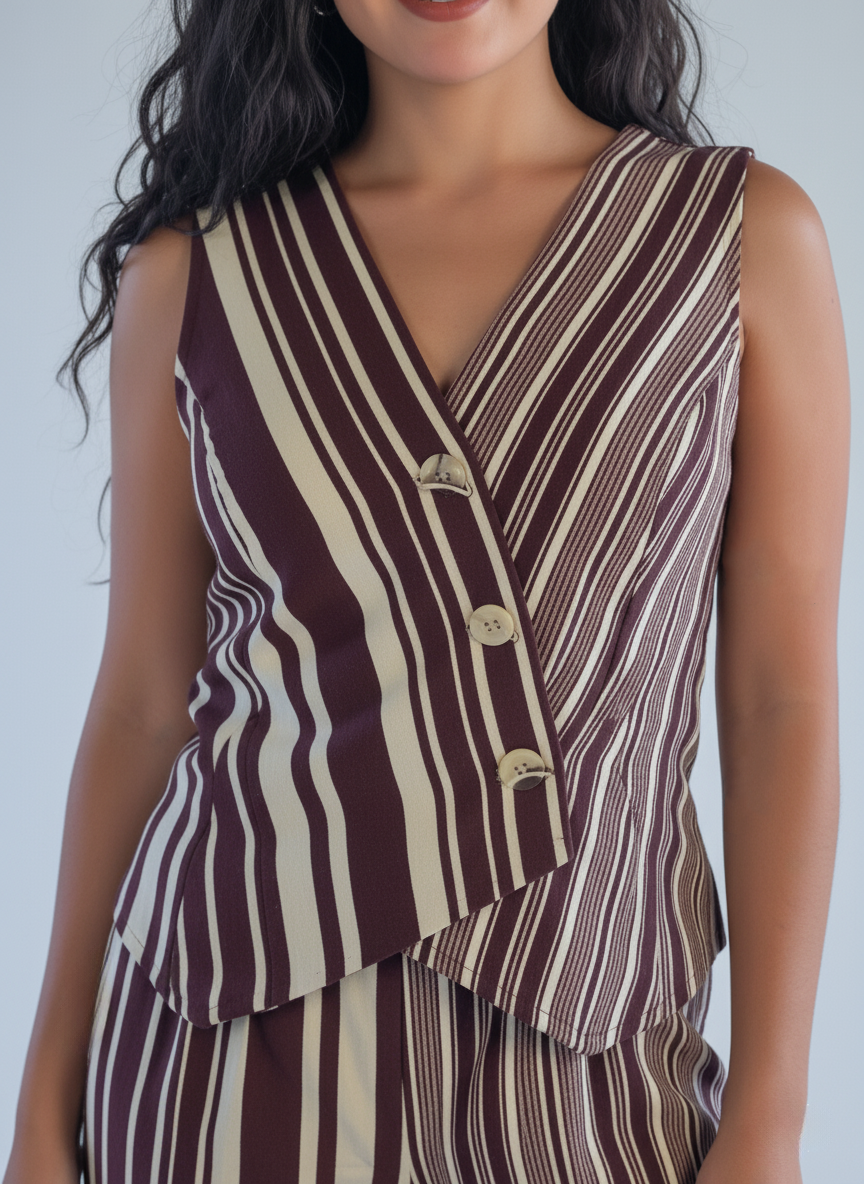 Conjunto formal rayado que combina elegancia y versatilidad. El chaleco estructurado con patrón de rayas proporciona un look sofisticado, mientras que el pantalón a juego garantiza una silueta impecable. Ideal para eventos corporativos, reuniones importantes o cualquier ocasión que requiera presencia profesional. Confeccionado con materiales de calidad que aseguran comodidad durante todo el día. Eleva tu guardarropa con esta propuesta clásica y atemporal.