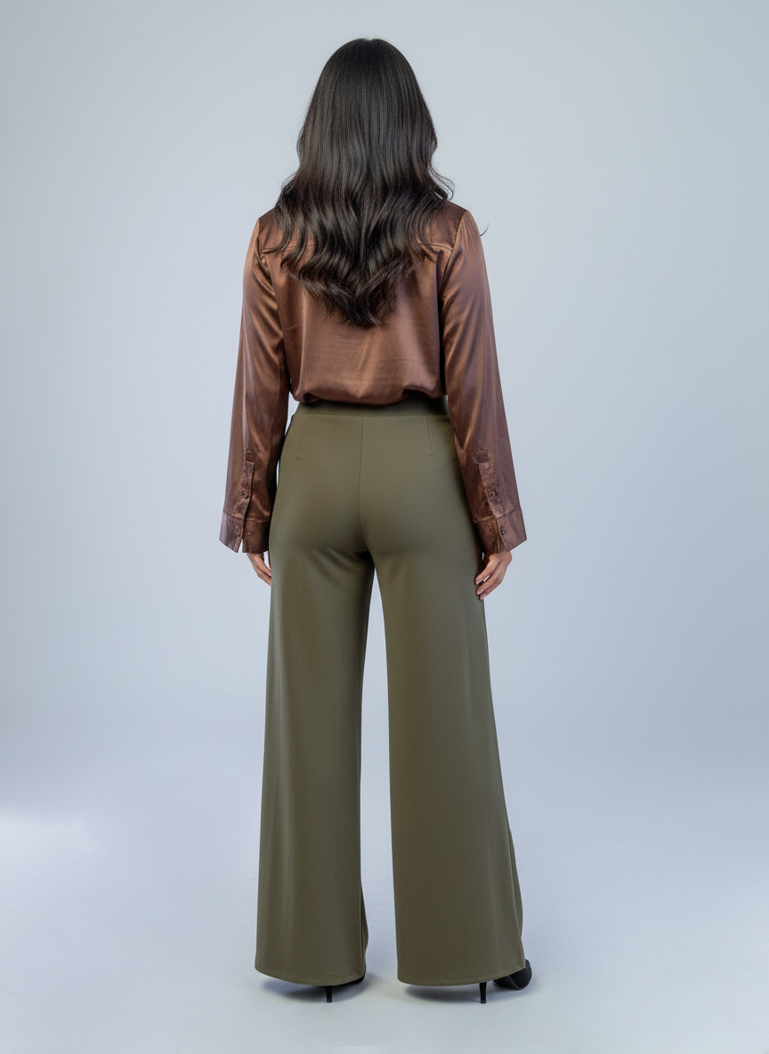 Pantalón acampanado en tono verde que combina comodidad y estilo contemporáneo. Diseñado con una silueta fluida que se expande desde la cadera, este básico versátil funciona tanto para looks casuales como para outfits más elaborados. La tela respira adecuadamente y mantiene su forma con el uso frecuente. Perfecto para crear capas y experimentar con diferentes estilos de calzado. Una pieza esencial que eleva cualquier guardarropa.