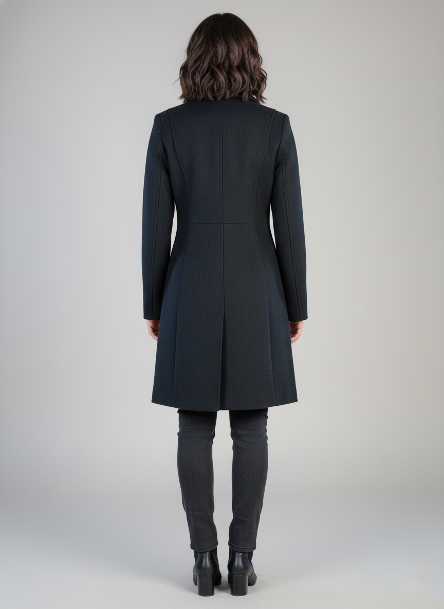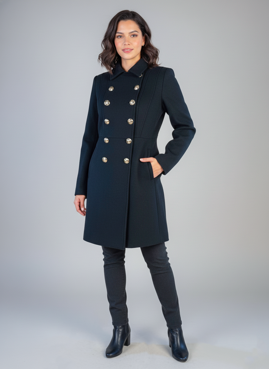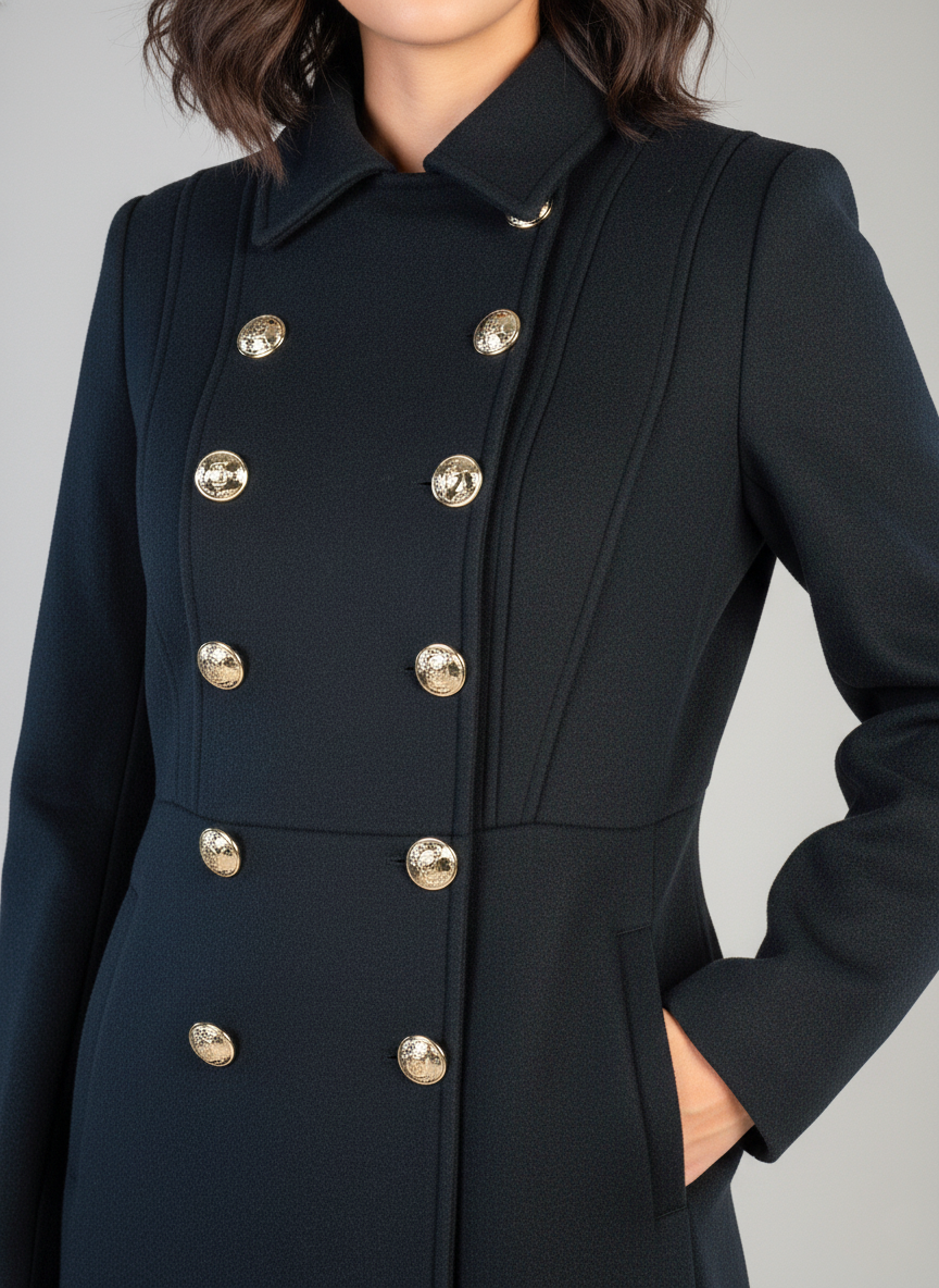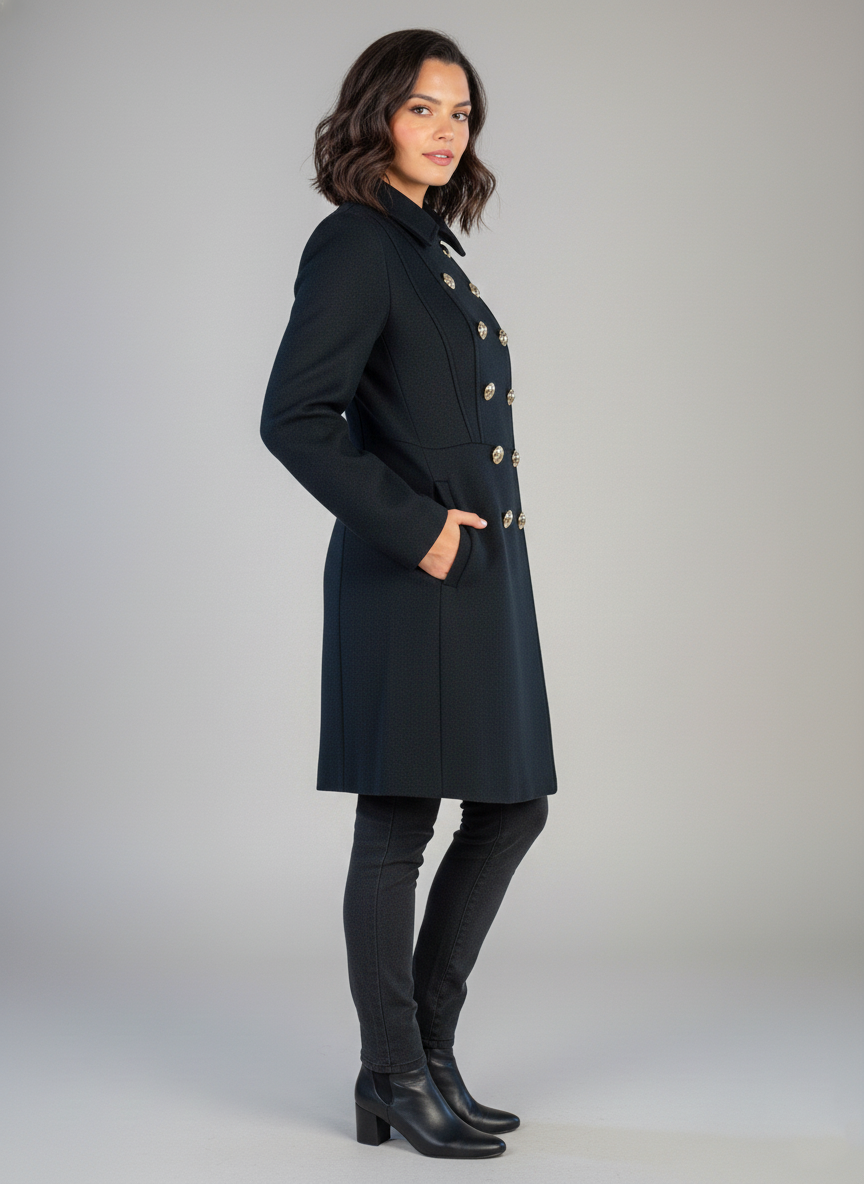 Saco negro abotonado doble corte semi largo que combina elegancia clásica con versatilidad moderna. Confeccionado con un corte estructurado que favorece la silueta, presenta doble botonadura frontal para un look sofisticado y ajustable. Su largo semi extendido ofrece cobertura equilibrada, ideal para crear outfits profesionales o casuales elevados. Perfecta pieza de transición que funciona sobre vestidos, jeans o pantalones. Tela de calidad que mantiene su forma y proporciona confort durante todo el día.
