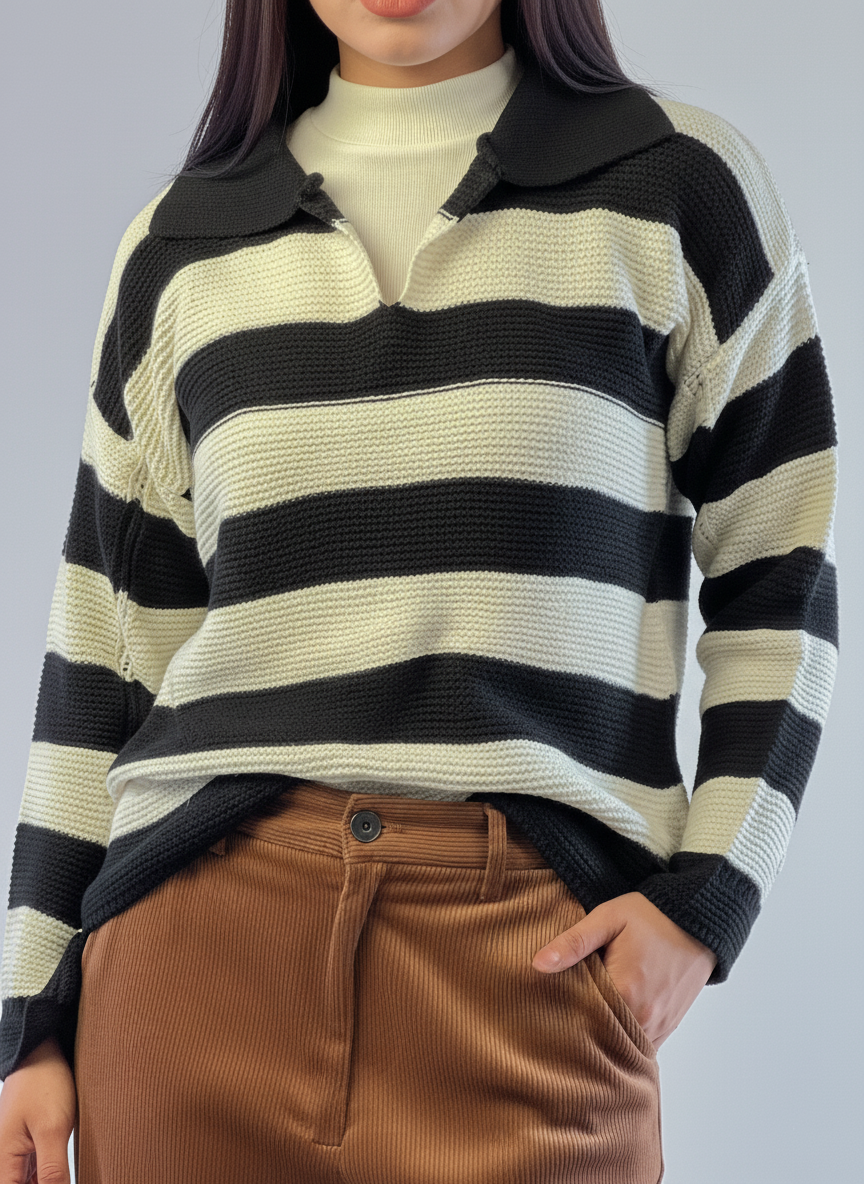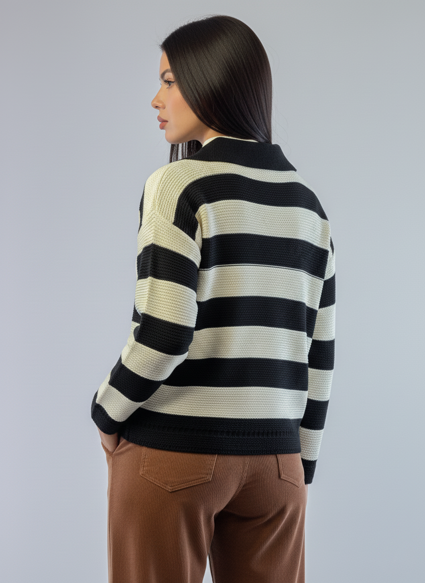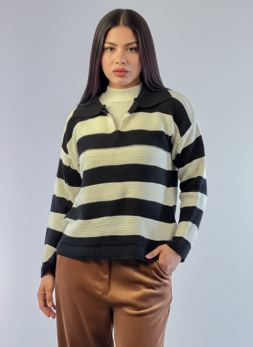 # Descripción del Producto Suéter tejido en algodón con patrón de rayas clásico y cuello en V profundo. Diseño versátil que combina con cualquier guardarropa, perfecto para capas o uso independiente. La tela de punto ofrece comodidad y transpirabilidad, mientras que el corte entallado favorece la silueta. Ideal para transiciones de temporada y looks casuales sofisticados. --- # Hashtags Sugeridos #SuéterARayas #CuelloEnV #ModaFemenina #RopaTejedora #EstiloClásico #ComfortStyle #ModaCasual #SuéterVersátil #TejidoDeAlgodón #LooksDeTransición #ModaAsequible #RopaDeTemporada