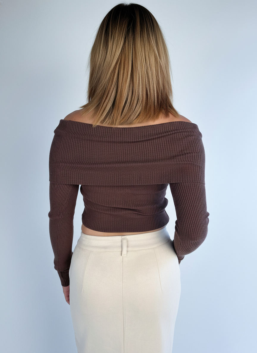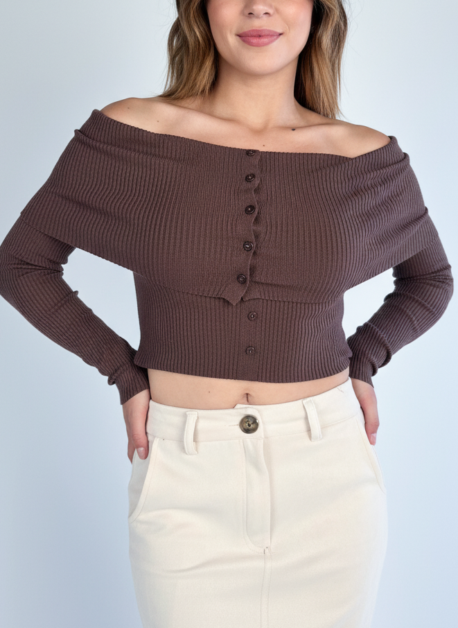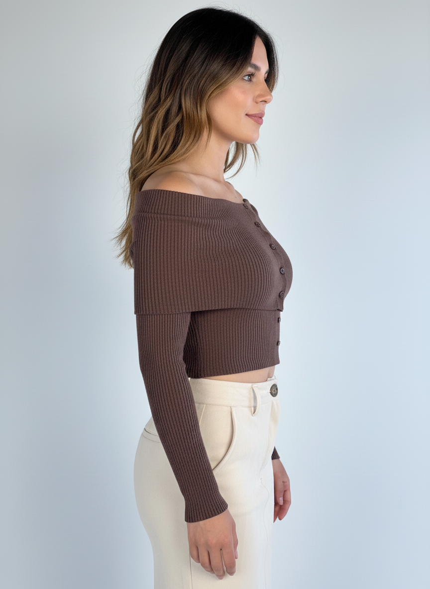 Suéter café tejido en acanalado que combina elegancia y comodidad. Diseño con hombro descubierto que realza la silueta, complementado con botones funcionales que añaden detalle sofisticado. Perfecto para crear looks versátiles, desde casual hasta semi-formal. La textura acanalada proporciona estructura y movimiento natural. Ideal para transiciones de temporada y ocasiones especiales. #SuéterCafé #HombroDescubierto #ModaFemenina #SuéterAcanalado #EstiloElegante #BocarosaStyle #ModaMexicana #SuéterConBotones #LookVersátil #TejidoDeCalidad