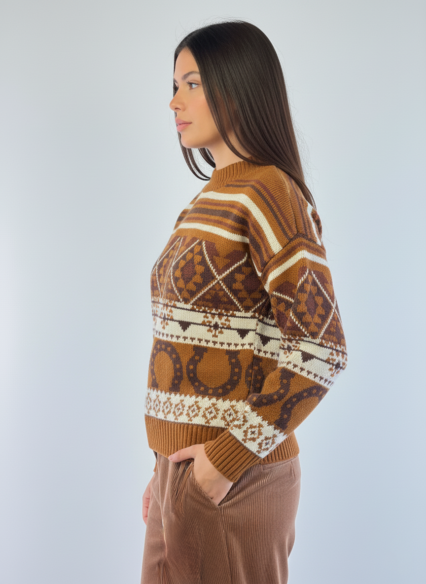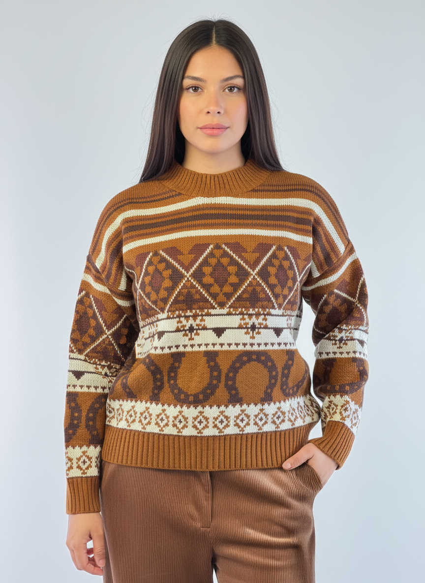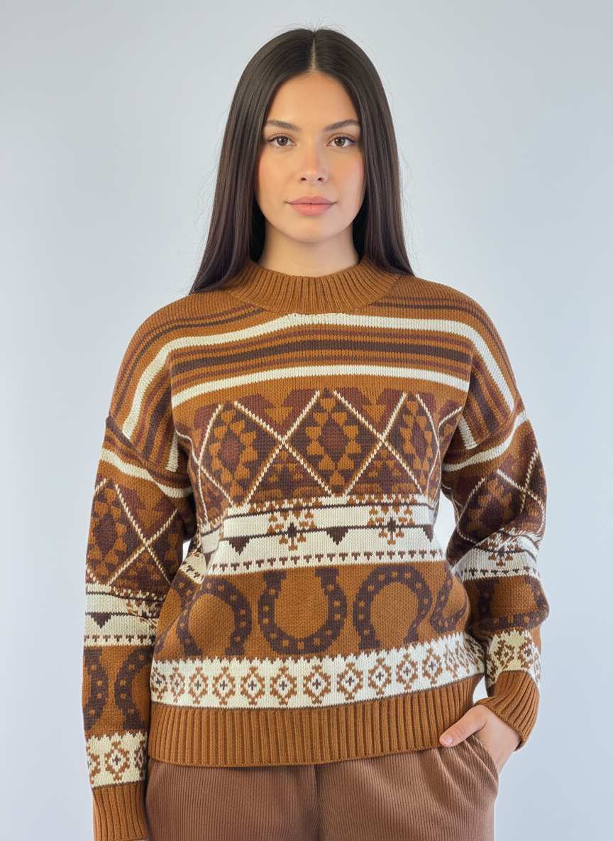 # Descripción del Producto Suéter tejido en café con diseño de rayas y figuras geométricas que añaden movimiento y sofisticación a tu guardarropa. Confeccionado con materiales de calidad, ofrece calidez y comodidad para el uso diario. Su patrón versátil combina fácilmente con jeans, pantalones neutrales o faldas, convirtiéndolo en una pieza esencial para cualquier estación. Perfecto para crear looks casuales o semi-formales sin sacrificar el confort. --- # Hashtags Sugeridos #SuéterCafé #DiseñoGeométrico #ModaConfort #SuéterRayas #PrendaVersátil #EstiloFemenino #BocarosaStyle #ModaCasual #TejidoDeCalidad #LookCompleto #FashionEsencial #SuéterTejido #ModaMexicana #ComfortStyle #DiseñoExclusivo