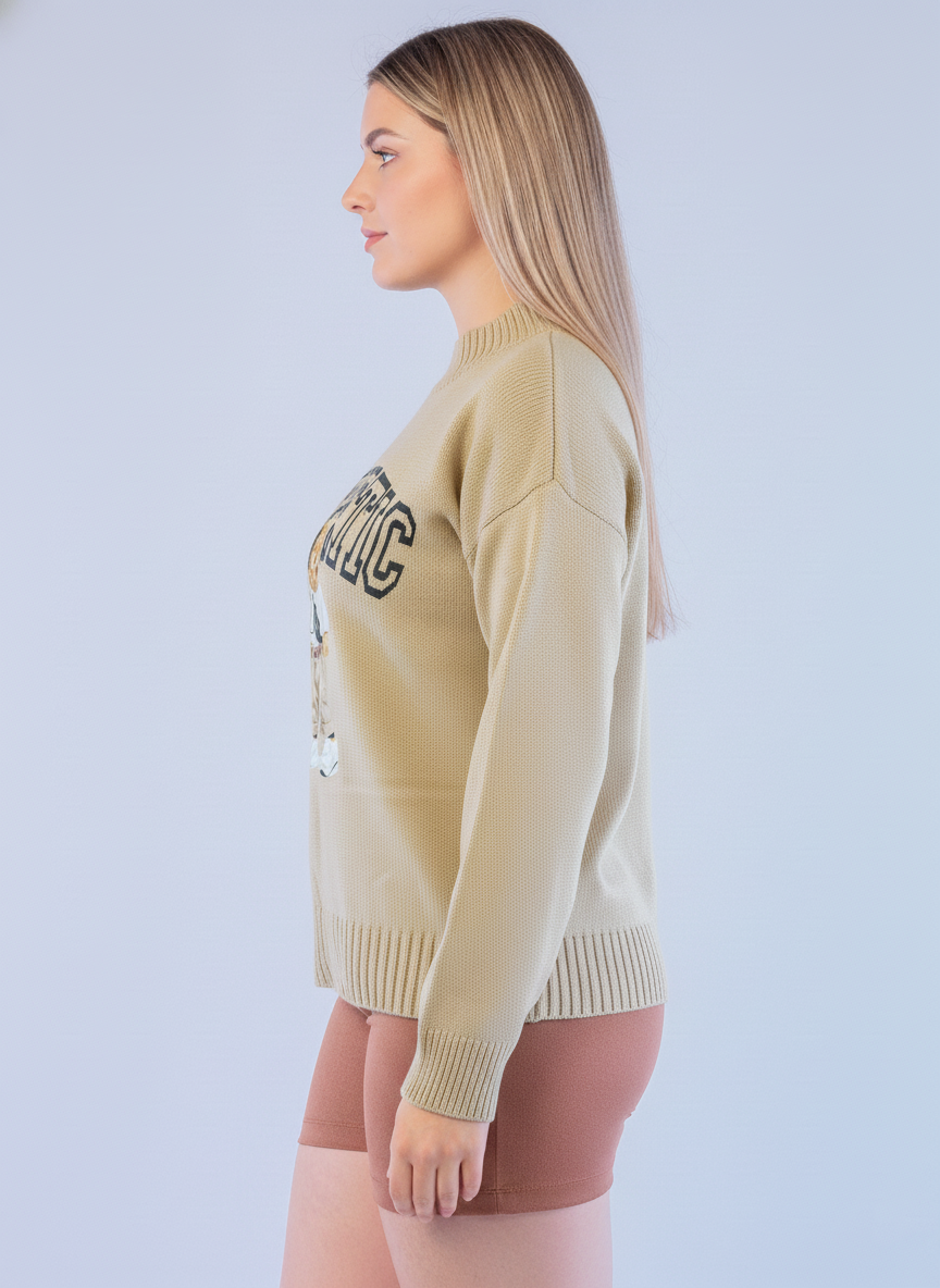 Suéter tejido en café con un estampado de oso que combina comodidad y estilo casual. Confeccionado en material suave y transpirable, ideal para capas versátiles en climas templados. El diseño gráfico del oso añade un toque distintivo y amigable a tu guardarropa diario. Perfecto para quienes buscan prendas que equilibren funcionalidad con personalidad visual.