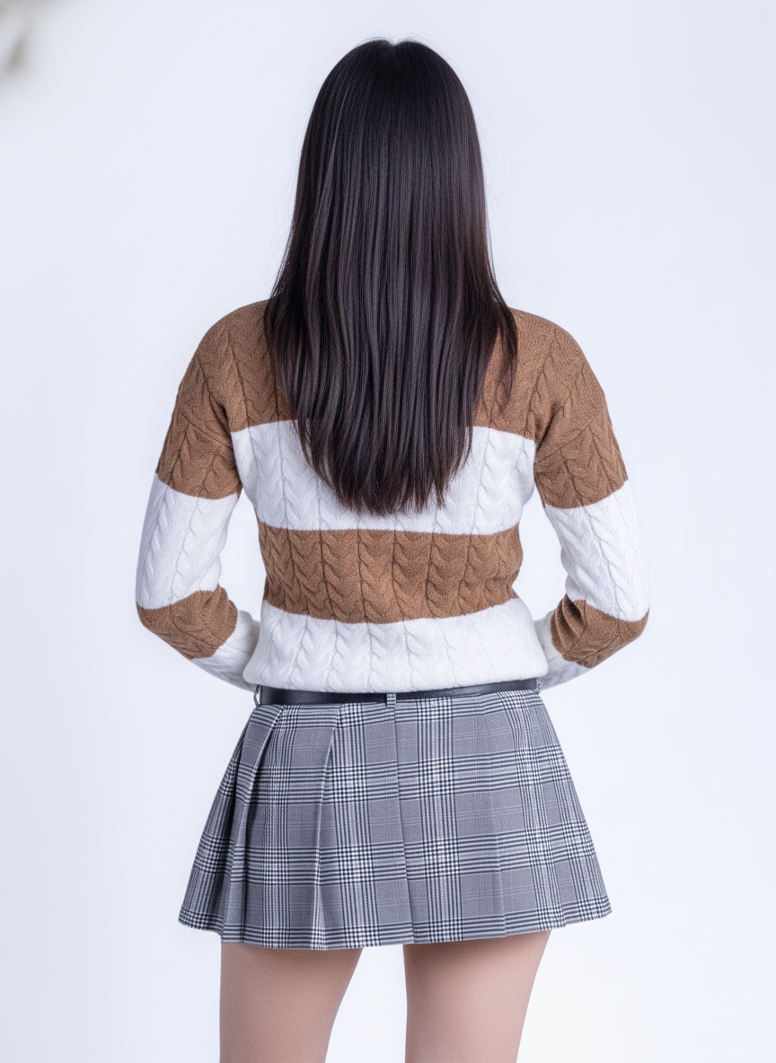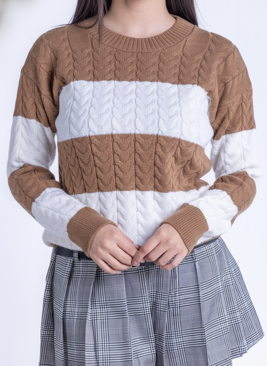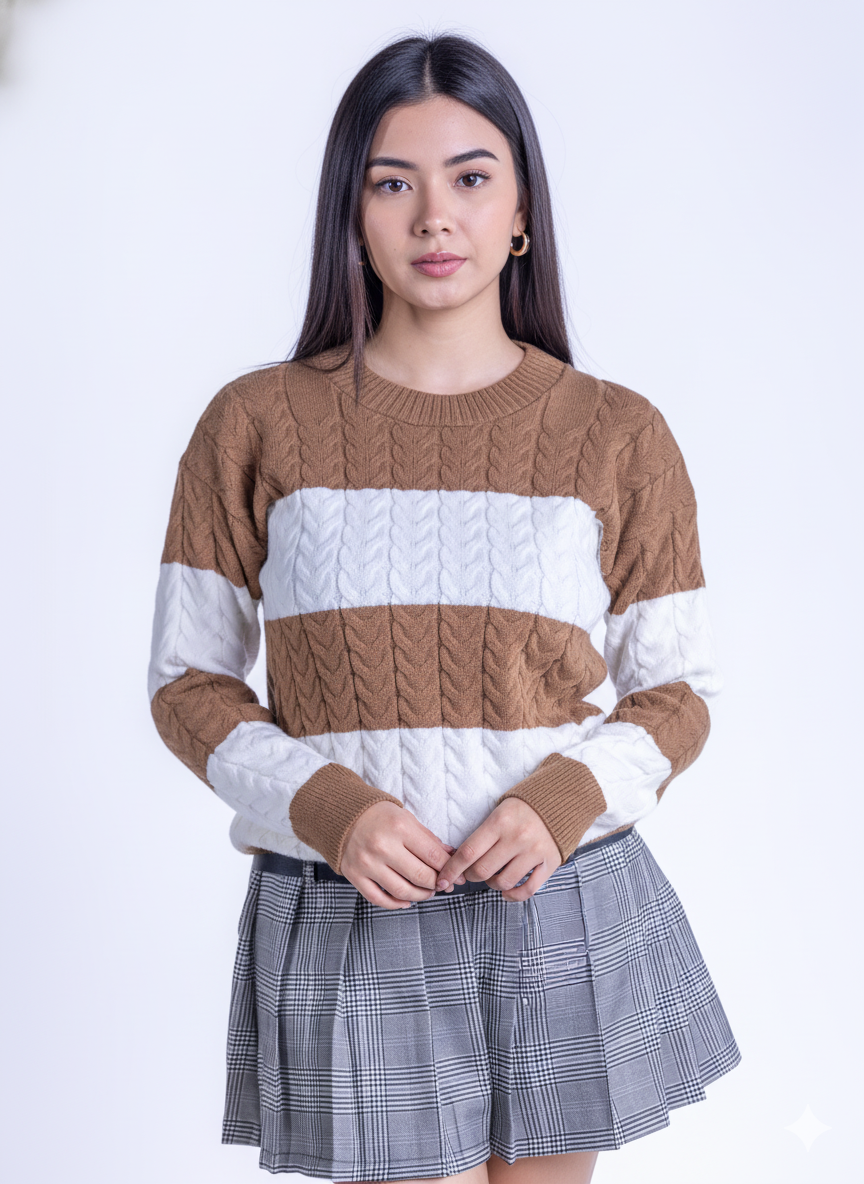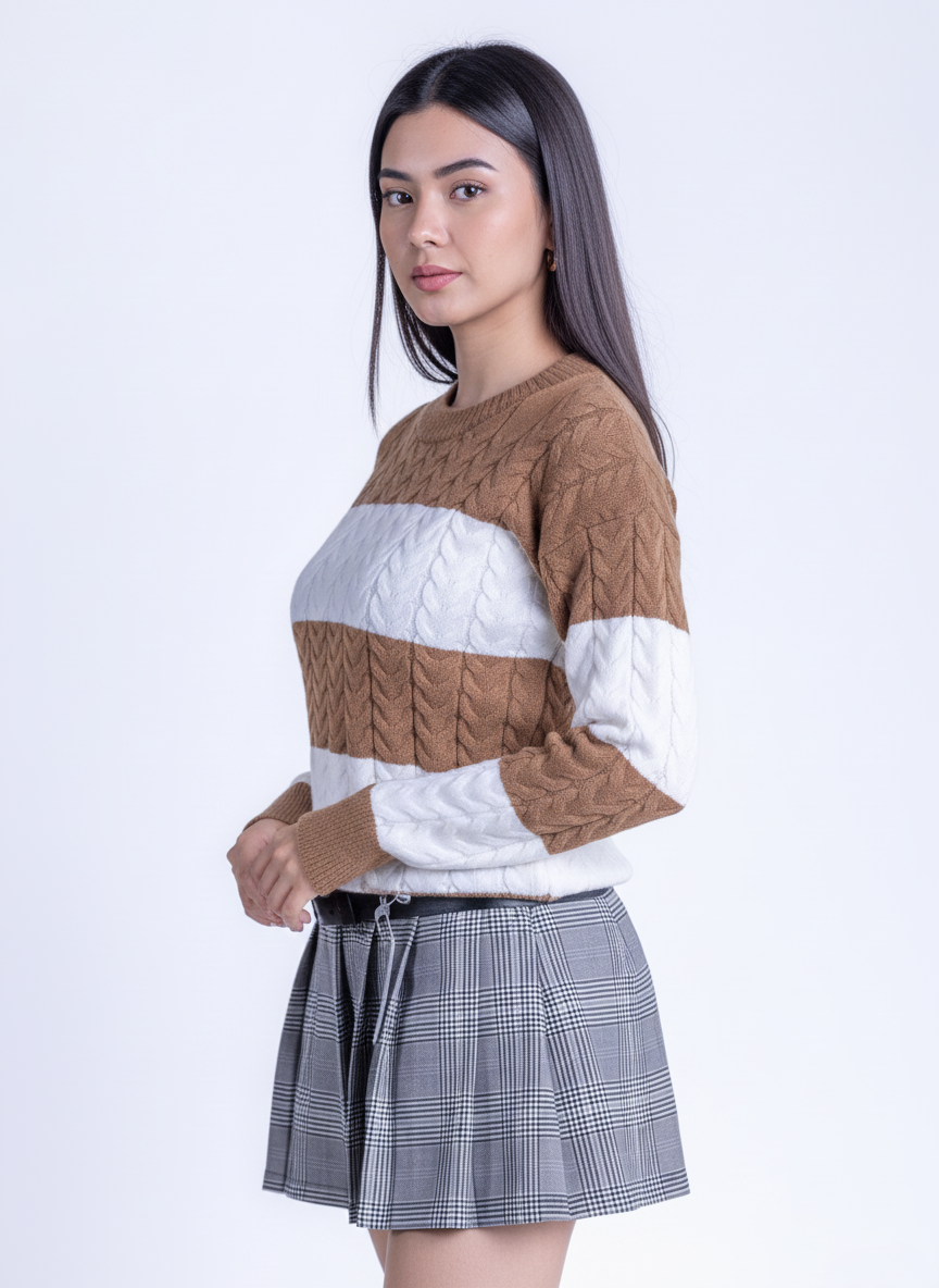 Suéter tejido en tonos café y blanco que combina comodidad y estilo. Confeccionado con materiales de calidad, presenta un cuello redondo clásico que se adapta a cualquier ocasión, desde el trabajo hasta encuentros casuales. Su patrón bicolor aporta versatilidad a tu guardarropa, permitiéndote crear múltiples outfits con prendas existentes. Ideal para capas en climas templados o como pieza central en looks minimalistas.