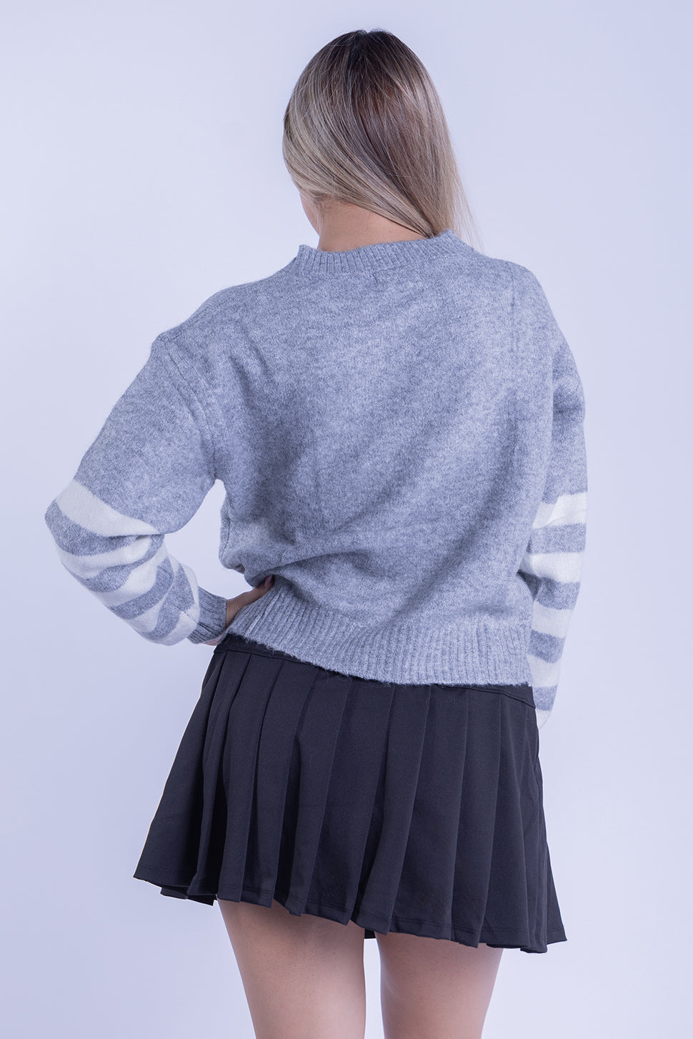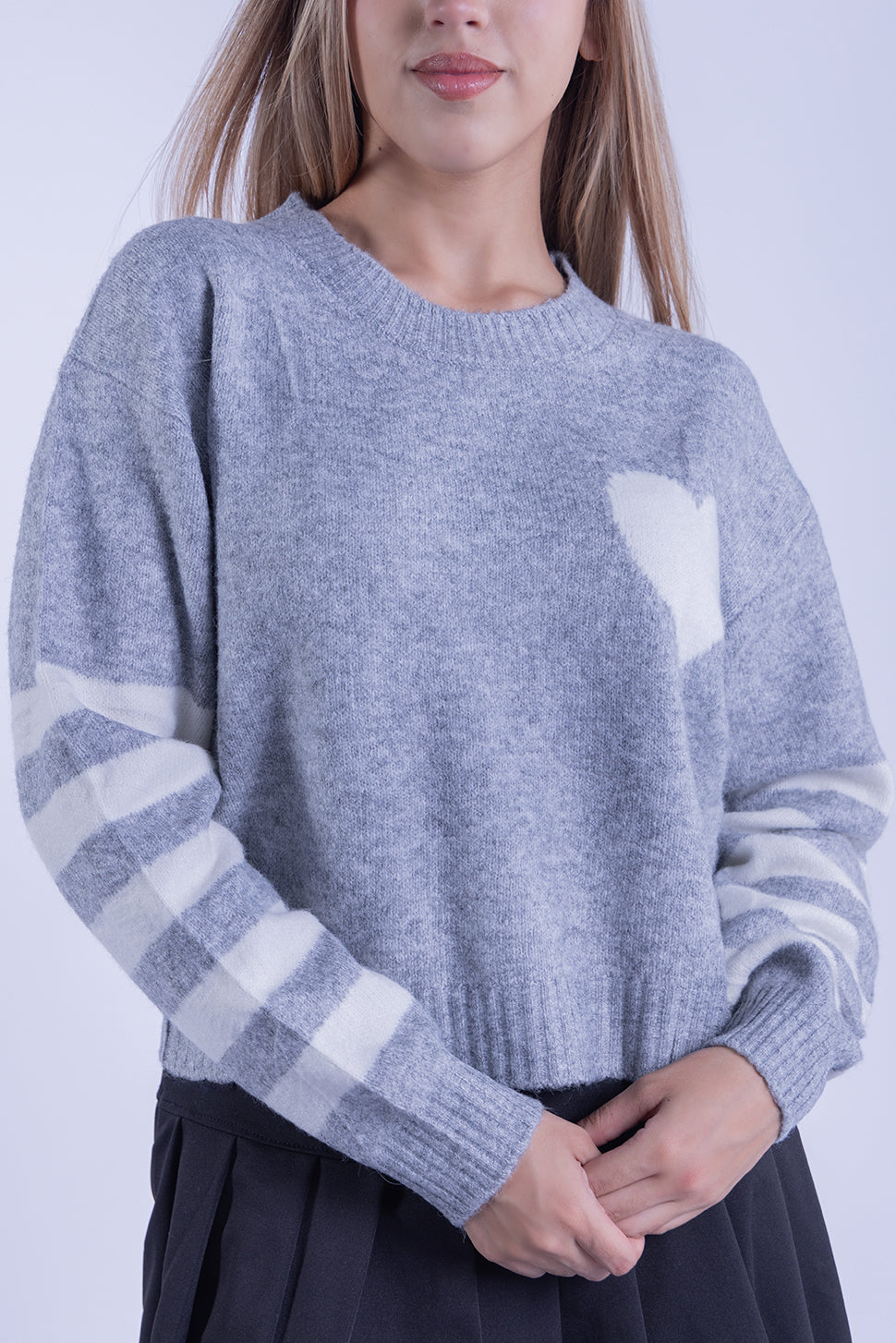 Descubre el encanto de este suéter en color gris, una pieza clave para cualquier guardarropa. Este suéter destaca por sus detalles bicolor en las mangas y un sutil corazón bordado a la altura del pecho, que le añaden un toque único y femenino. Su diseño es moderno y versátil, perfecto para combinar con tus jeans favoritos o una falda elegante.