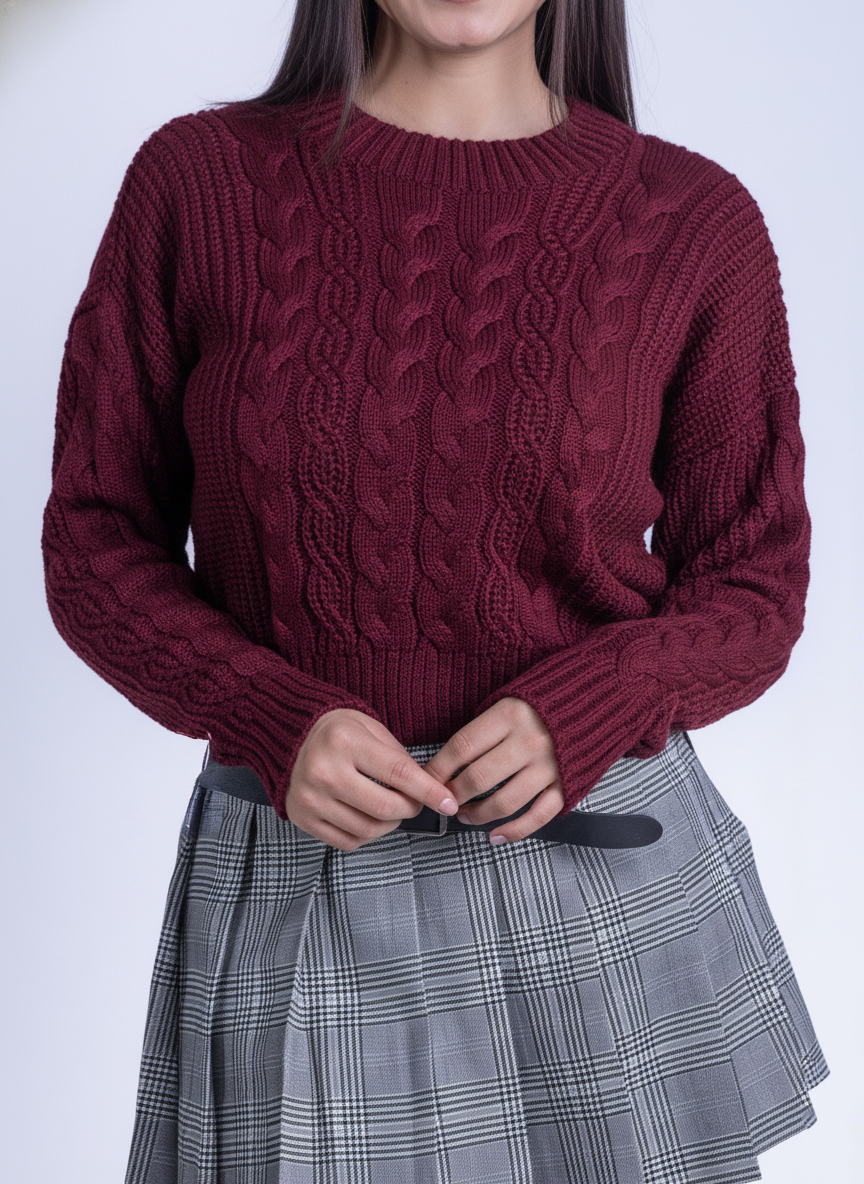 **Descripción del producto:** Suéter tejido en tono guinda profundo que combina elegancia y comodidad. Presenta un diseño de trenzas texturizadas que añaden dimensión y sofisticación a cada uso. Su cuello redondo clásico se adapta a diferentes estilos y ocasiones, desde looks casuales hasta más formales. Confeccionado con materiales de calidad que garantizan durabilidad y calidez. Perfecto para crear outfits versátiles durante las estaciones frías.
