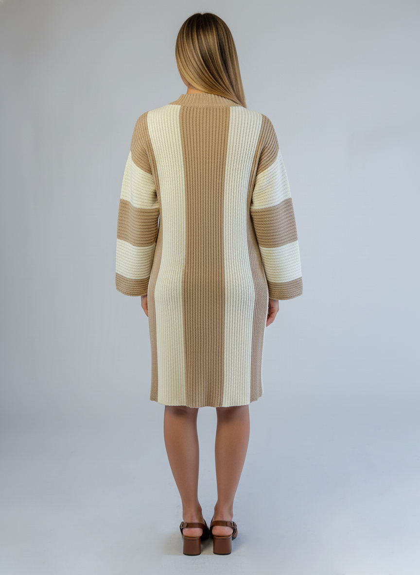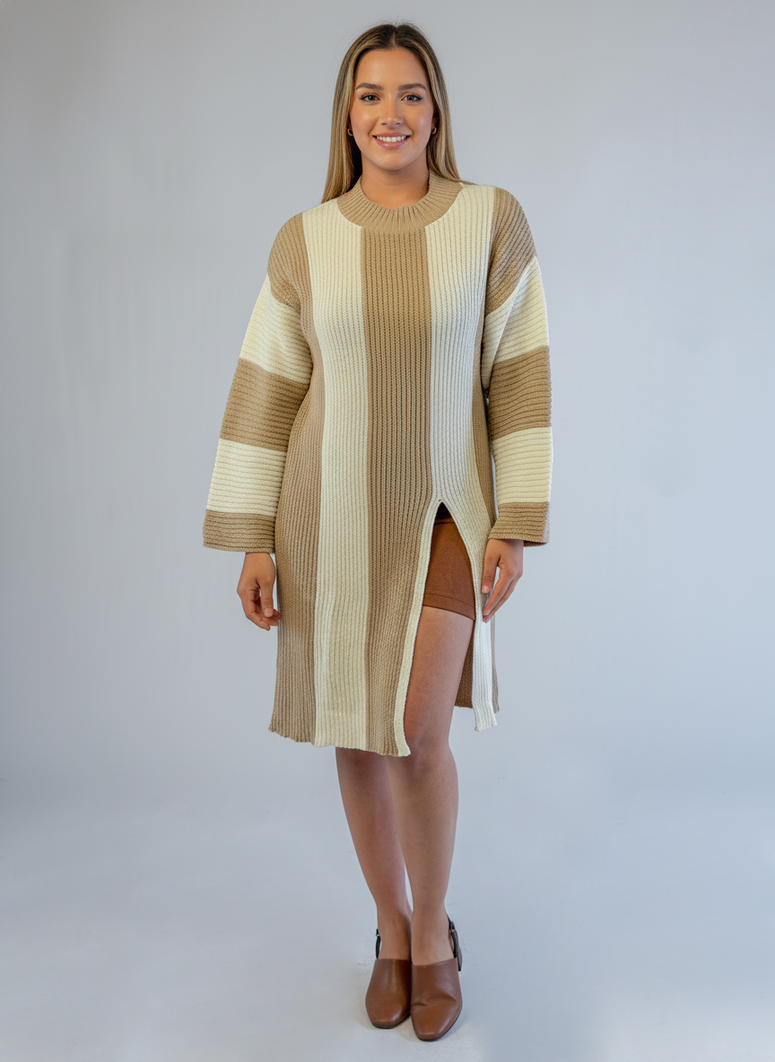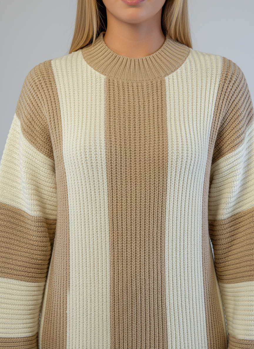 Suéter de punto tejido en rayas alternas beige y blanco que combina comodidad y estilo versátil. Su largo generoso proporciona cobertura completa, ideal para capas en climas frescos o como pieza central de tu outfit. El tejido de calidad mantiene su forma tras múltiples lavados, mientras que el patrón a rayas añade movimiento visual sin sacrificar elegancia. Perfecto para looks casuales o semi-formales. #SuéterRayado #TejidoBeige #ModaInvierno #SuéterLargo #EstiloVersátil #PrendaEsencial #ComodidadYEstilo #ModaFemenina #TejidoDeCalidad #OutfitPerfecto