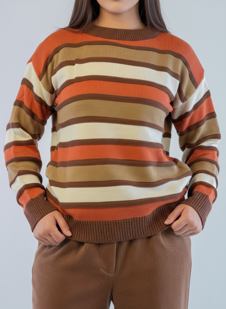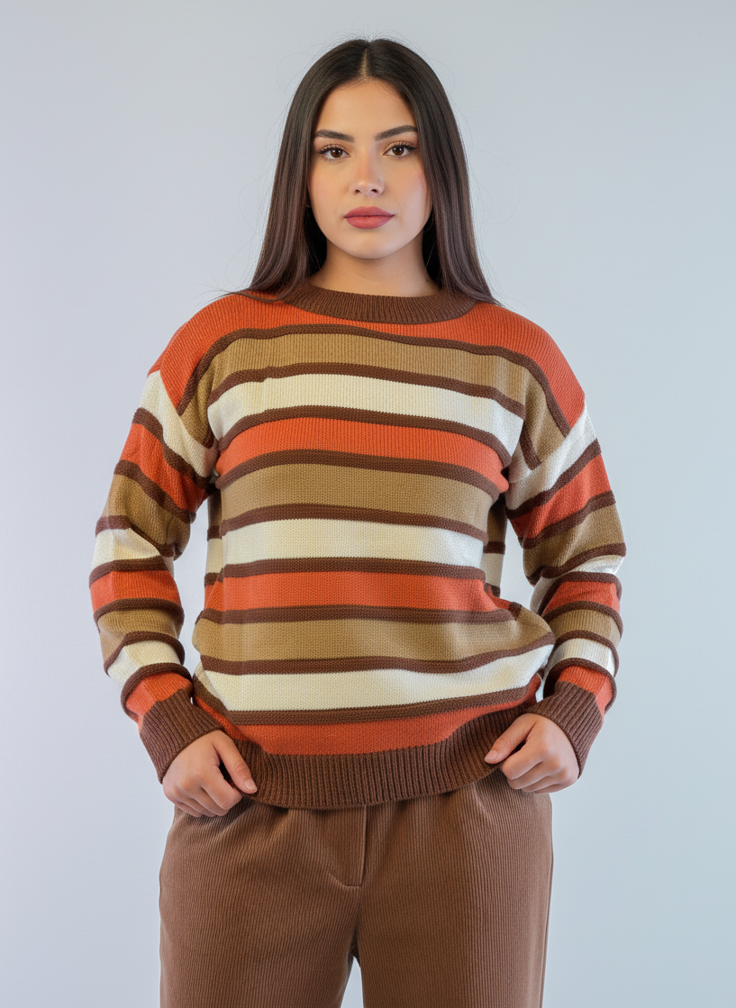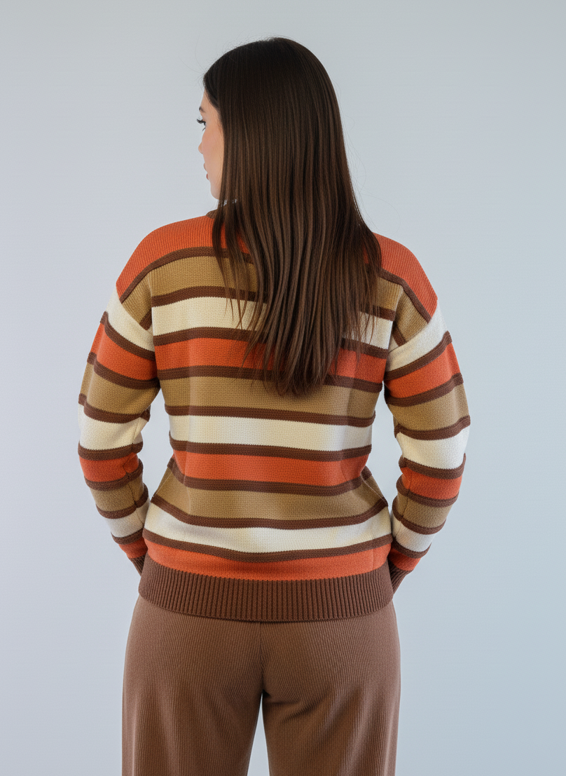 Suéter de punto en tonalidad naranja vibrante con rayas horizontales que crean un contraste visual dinámico. Confeccionado con materiales de calidad, ofrece calidez y comodidad para el uso diario. El diseño clásico de rayas lo convierte en una pieza versátil que combina fácilmente con diferentes prendas de tu guardarropa. Ideal para crear looks casuales con personalidad. #SuéterNaranja #RayasHorizontales #PuntoDiseño #ModaCasual #ComodidadYEstilo #SuéterVersátil #OtoñoInvierno #LooksCasuales