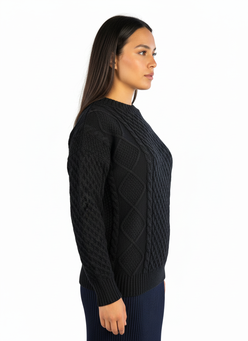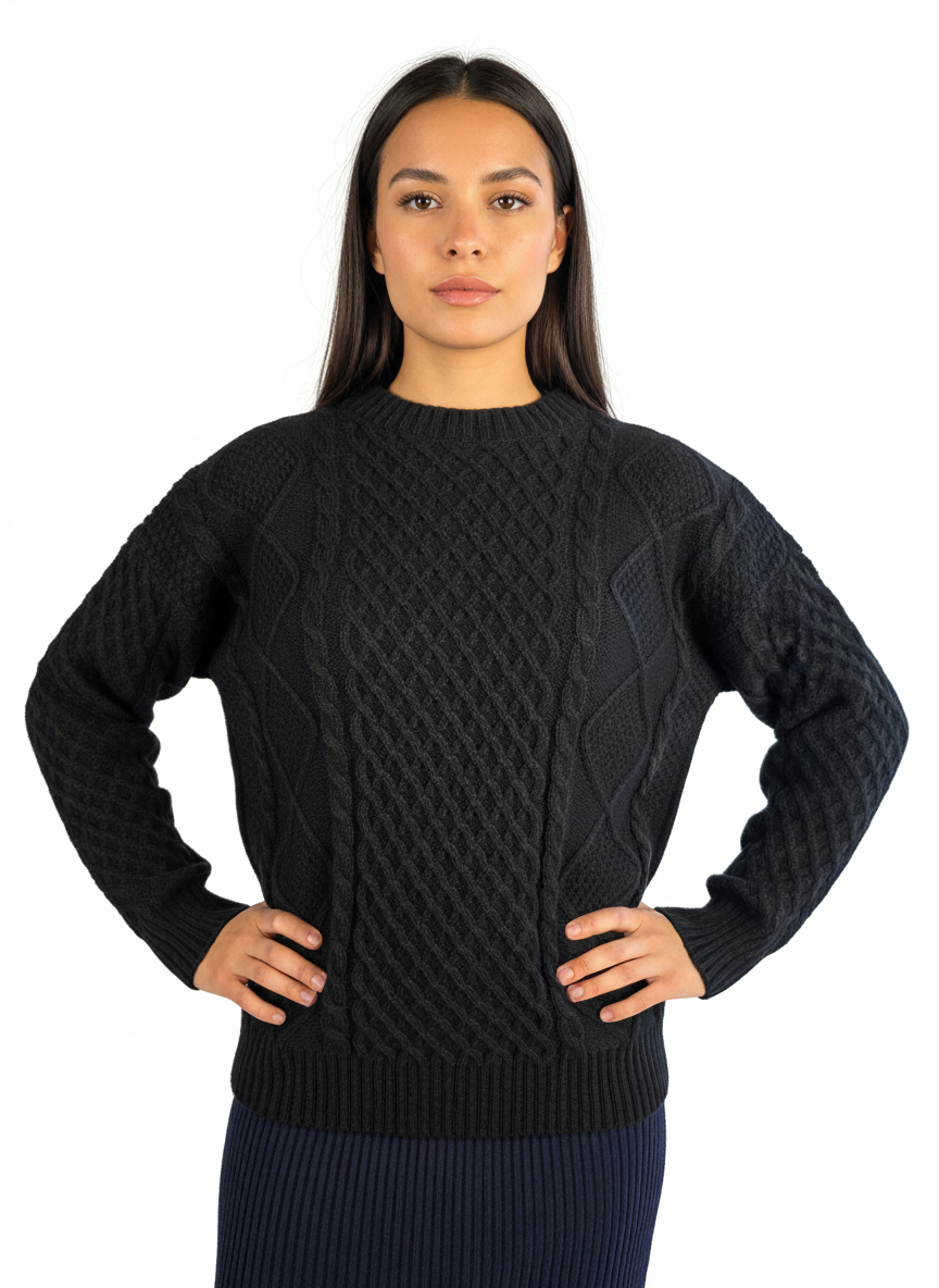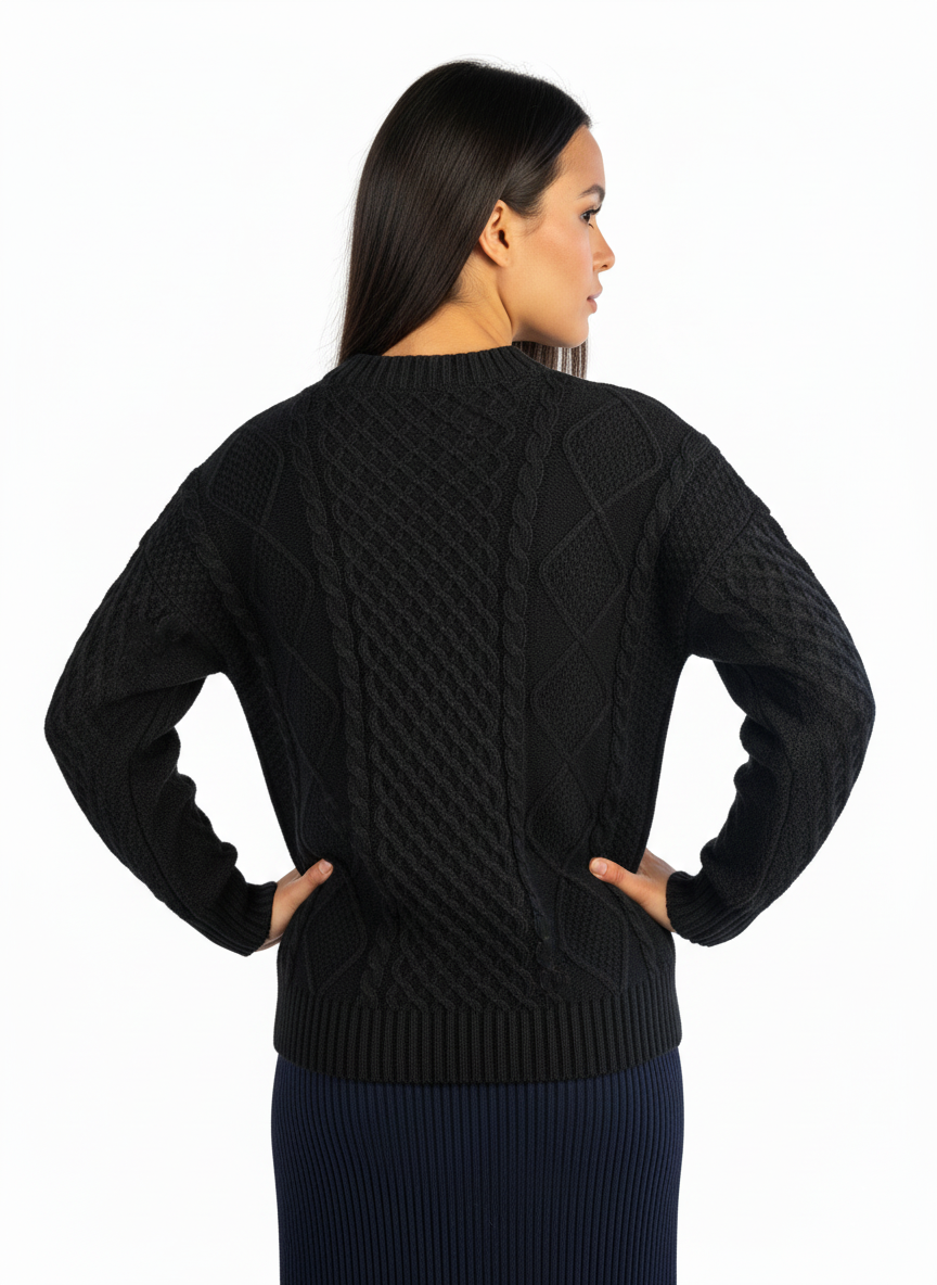 Este suéter negro presenta un tejido cuadriculado que aporta textura y sofisticación a cualquier look. Su diseño clásico y el color neutro facilitan la combinación con diversas prendas, permitiendo un estilo versátil tanto para ocasiones casuales como formales. Ideal para mantener el confort sin sacrificar elegancia durante el día a día. #SuéterNegro #TejidoCuadriculado #ModaVersátil #EstiloConfortable #EleganciaCasual