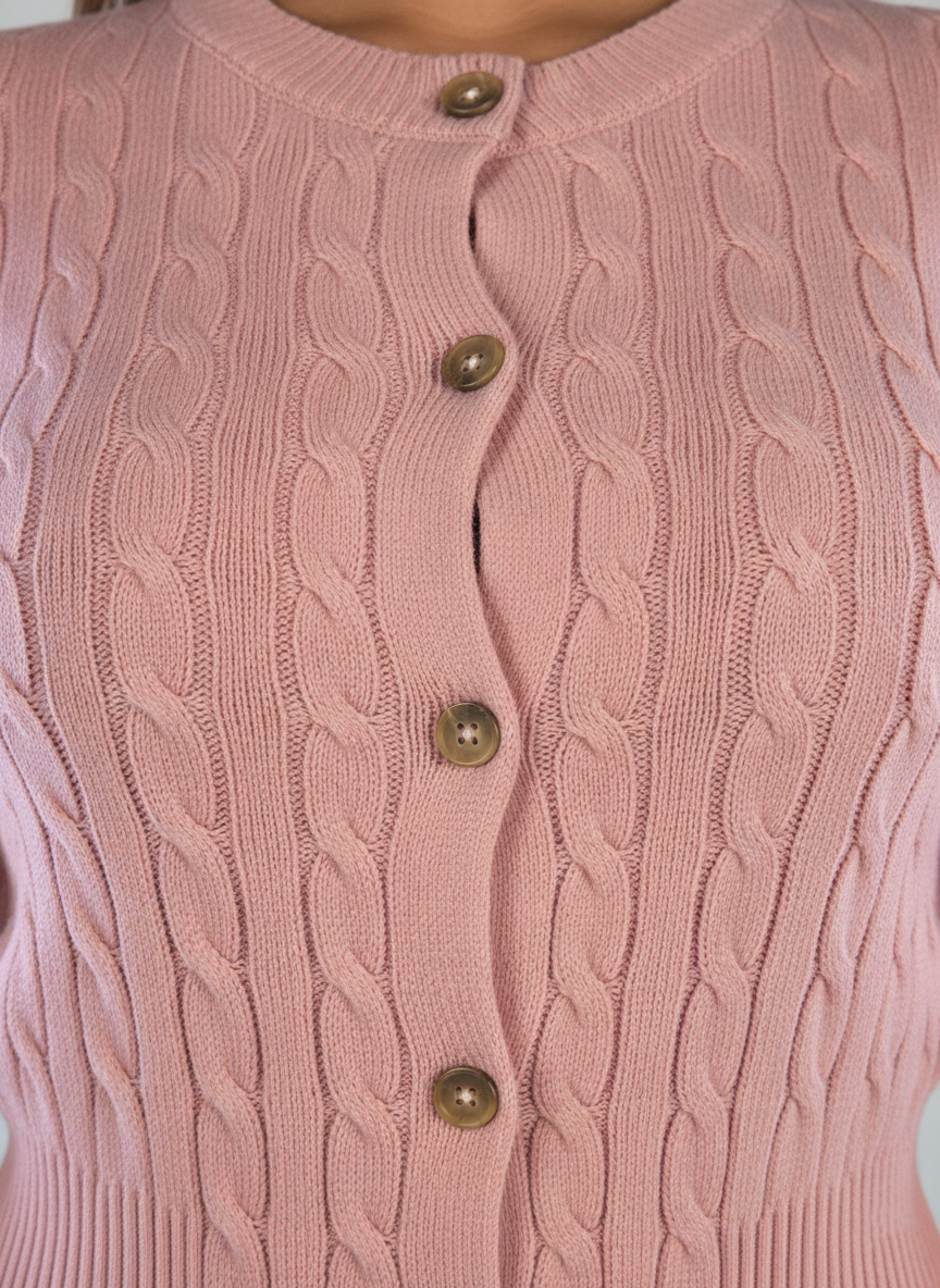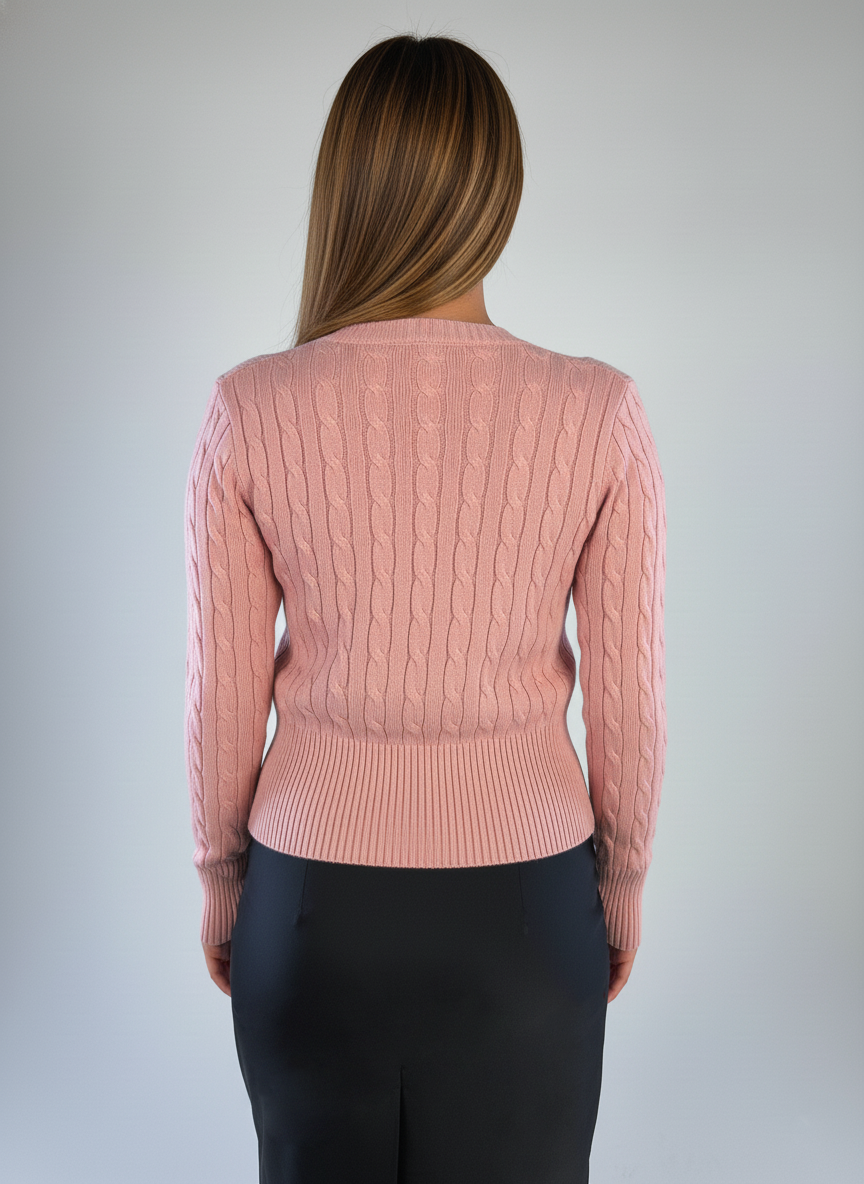 Suéter confeccionado en tejido acanalado que ofrece una textura sofisticada y una caída elegante. Su tonalidad rosa proporciona versatilidad para combinar con diferentes prendas de tu guardarropa. El cierre de botones permite un ajuste personalizado y facilita su colocación, mientras que la estructura acanalada brinda comodidad y flexibilidad en el movimiento. Una pieza esencial que trasciende las tendencias, perfecta para crear looks tanto casuales como más refinados.