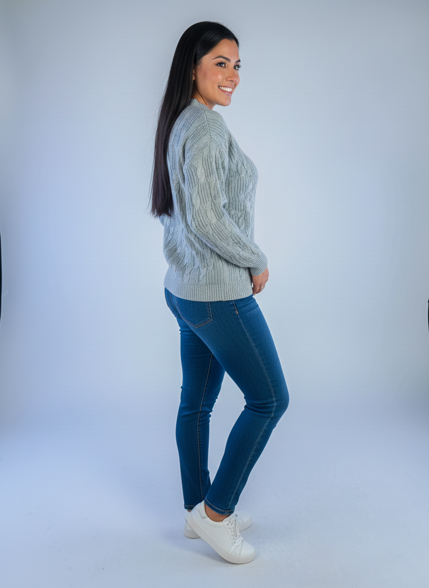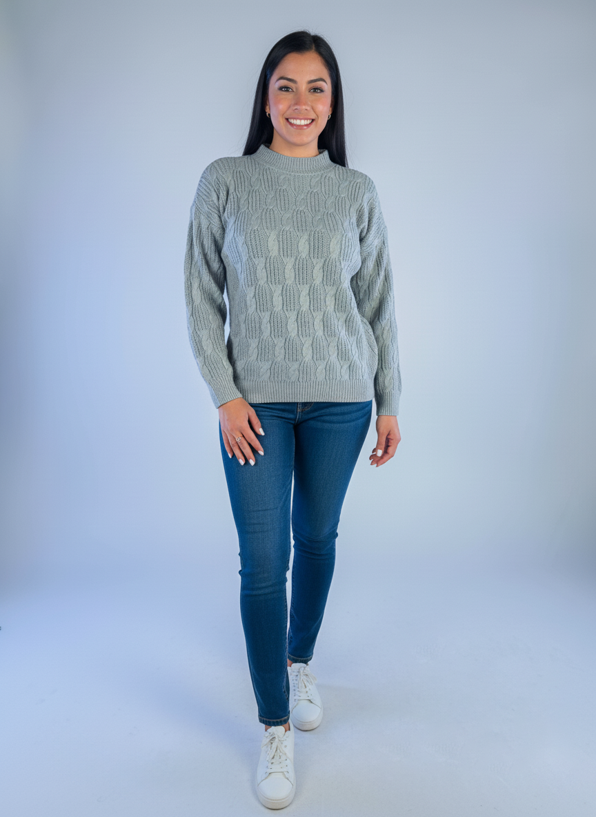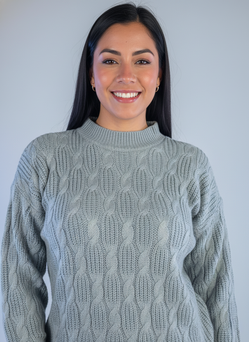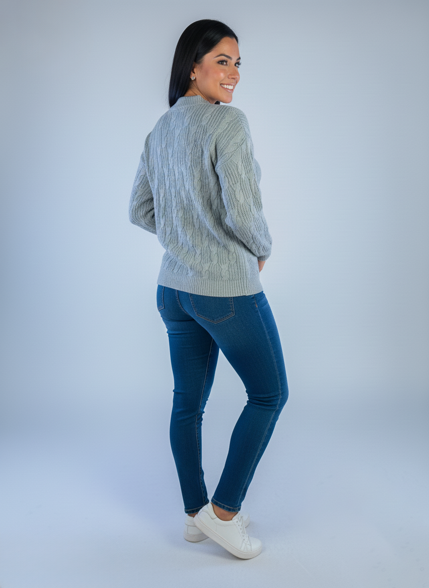 Suéter tejido en gris con detalle de trenzas que añade textura y sofisticación a tu guardarropa. Confeccionado con técnica de tejido tradicional, ofrece calidez y comodidad para las estaciones frías. El patrón de trenzas proporciona un acabado elegante y versátil, perfecto para combinar con diferentes prendas. Ideal para crear looks casuales o semi-formales con facilidad. #SuéterGris #TejidoTrenzas #ModaInvierno #SuéterCómodo #EstiloElegante #PrendaVersátil #TejidoTradicional #BocarosaStyle