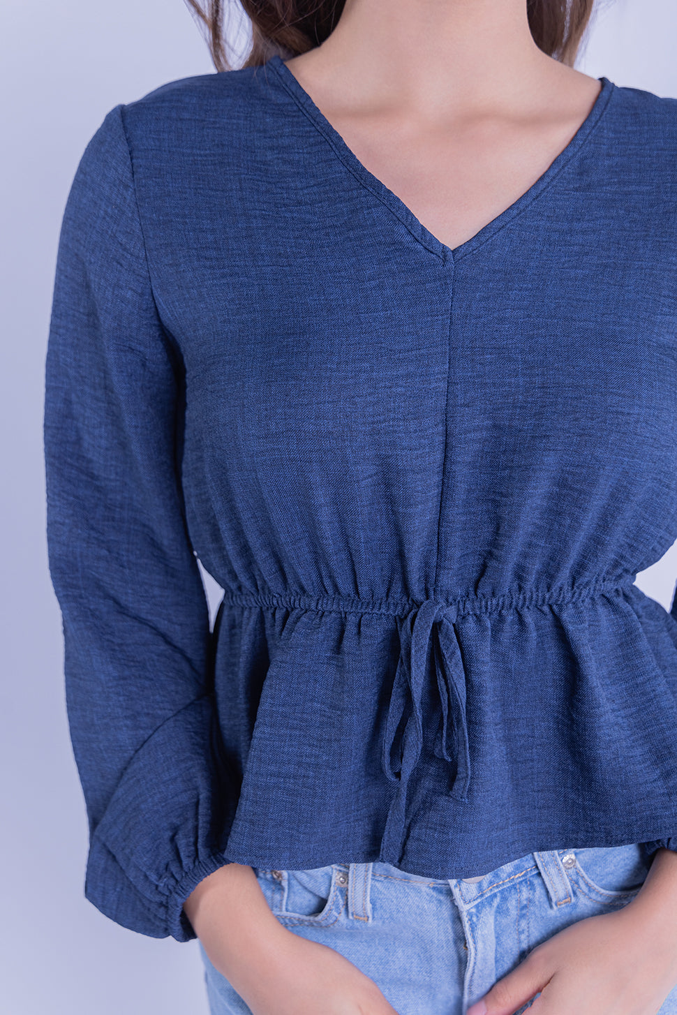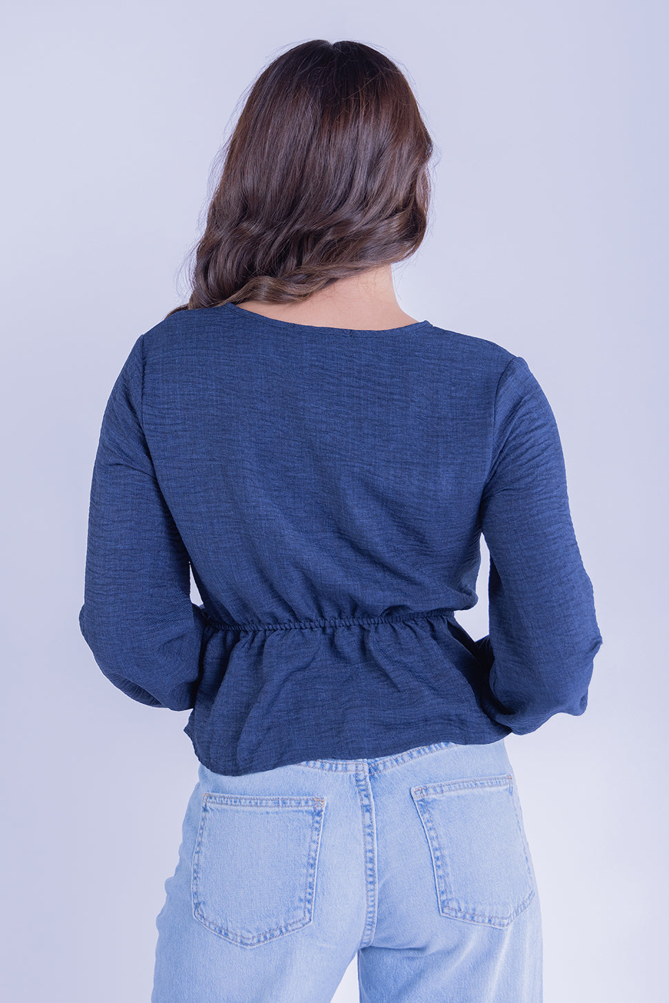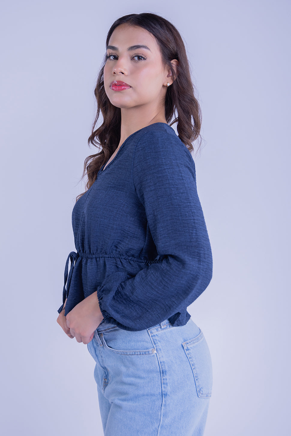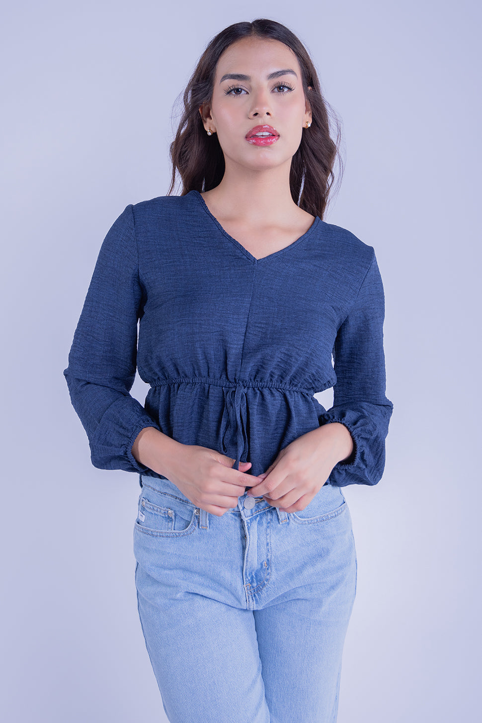 Este top de manga larga en un vibrante color azul es ideal para cualquier ocasión. Su diseño versátil incluye un amarre en la parte delantera que te permite ajustarlo a tu gusto, creando un escote en V favorecedor. Confeccionado en un tejido suave y ligero, es cómodo y perfecto para llevarlo de día o de noche. Combínalo con tus jeans favoritos para un look casual o con una falda para un estilo más elegante y femenino.