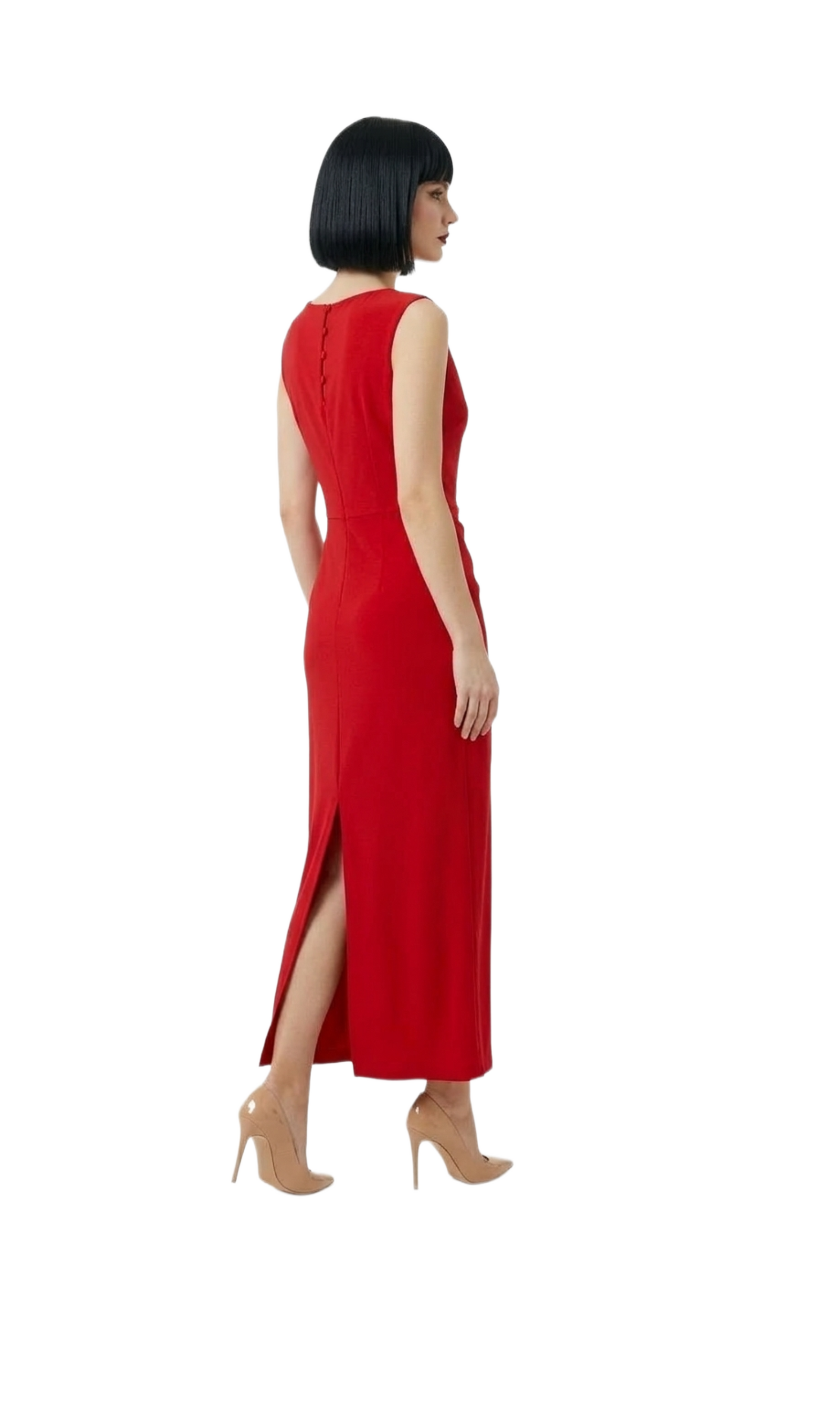 Vestido rojo largo con plisado lateral y metal decorativo